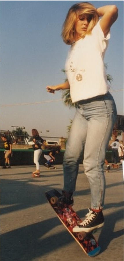 “There is another faction of skateboarders who are inspired more by surf fashions than punk. Thirteen-year-old April Hoffman, for instance, is so straight-edged, as the Hags would say, she doesn’t even have Hag potential. April was one of only two girls competing on a recent morning in a Venice meet sponsored by the California Amateur Skateboard League. She wheeled onto the concrete stage wearing pink high-top tennis shoes, rolled white socks and a tiny gold skateboard on a chain around her neck. She began her routine to a Go-Go’s tune, ‘Head Over Heels.’ Her bobbed blonde hair bounced jerkily as she attempted a ’50-50,’ a trick in which the competitor jackhammers the tip of the board into the ground by jumping up and down. ‘Go April,’ roared her fans, mostly boys in baggy trunks. ‘Rippin’ April.’”