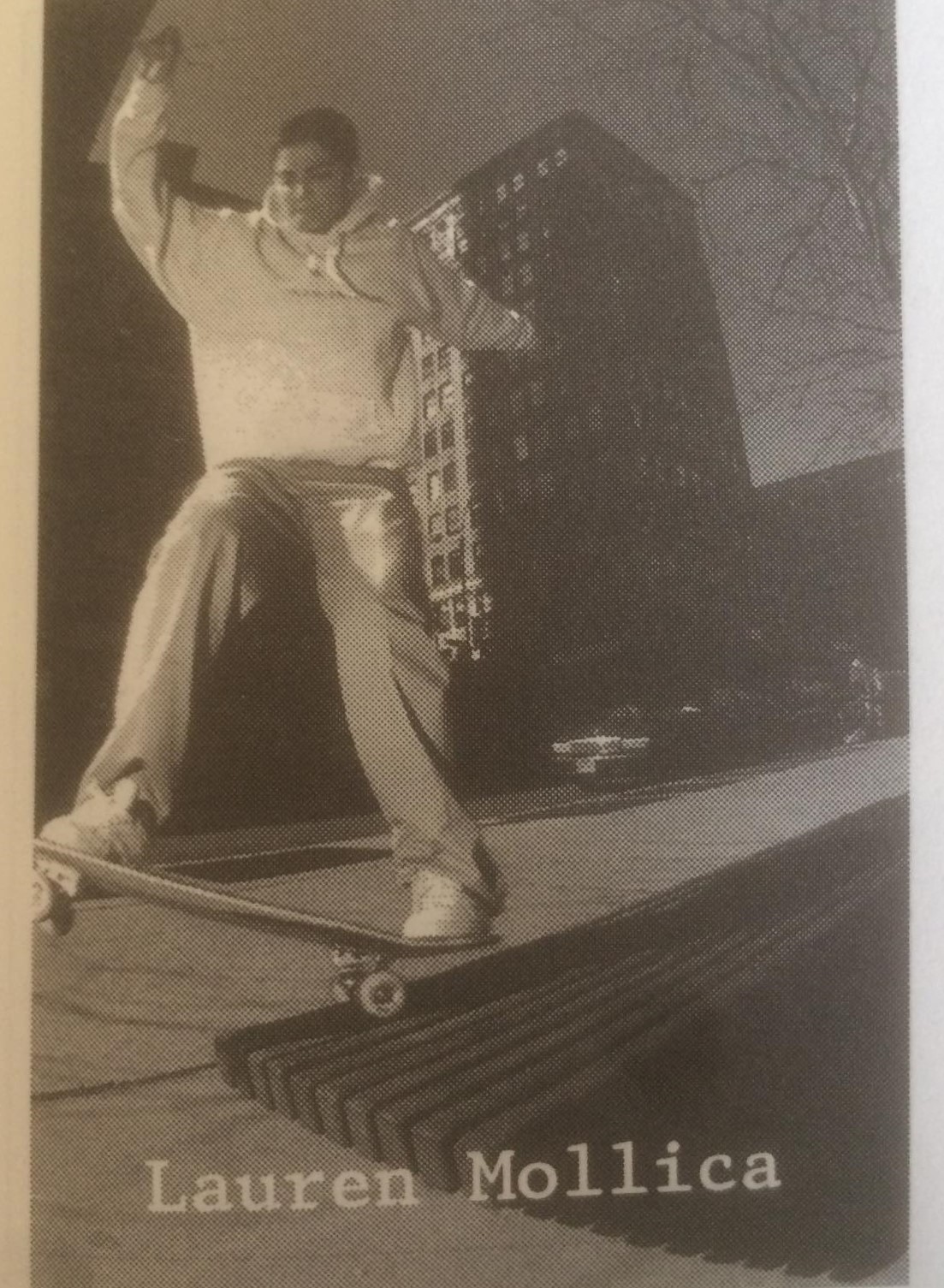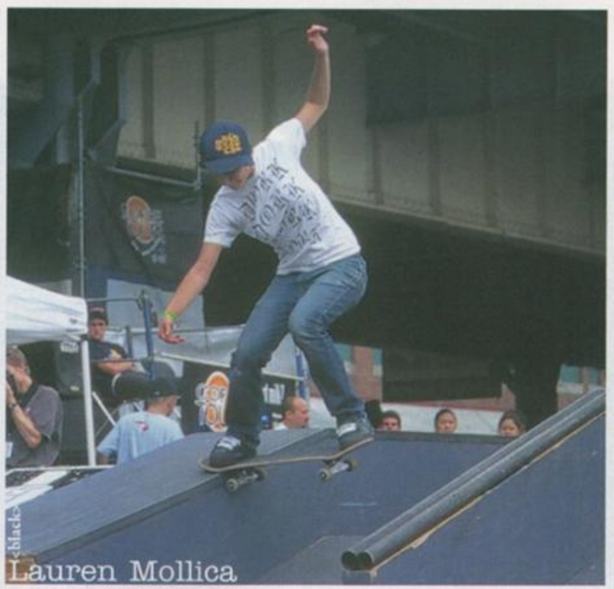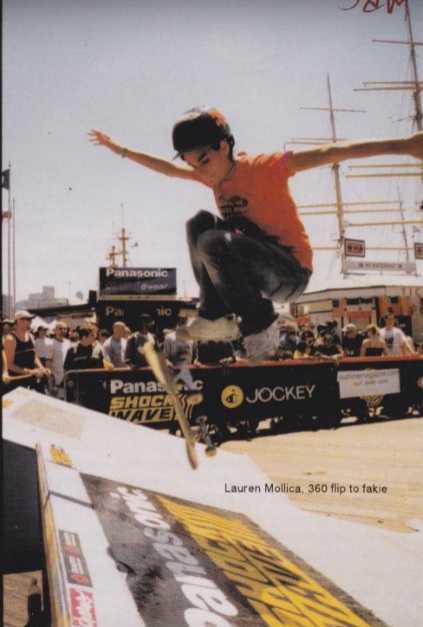 Lauren Mollica of New Brunswick, New Jersey (born in 1980) initially was a snowboarder, although she started dabbling in skateboarding in the late 1980s with her brothers. Lauren received her first board when she was 8 years-old, which was a Sims Kevin Staab, that she bought specifically because it featured pirates, combined with purple grip, green wheels, rails, etc. At that point, it was just skating in her driveway and on the street by her house.