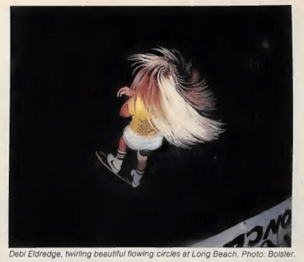 Debi Eldredge (sometimes misspelled “Debbie Eldridge”) was on the Unity Skateboard team back in the mid-1970s along with her friend Andra Malczewski and Mary Zerkie. Debi and Andra were revered by Laura Thornhill, as they were the first female skaters that she rode with on Hermosa Beach, and Thornhill originally dreamed of being sponsored on their team, which she shared in an interview with Juice Magazine (Dec. 2008).
