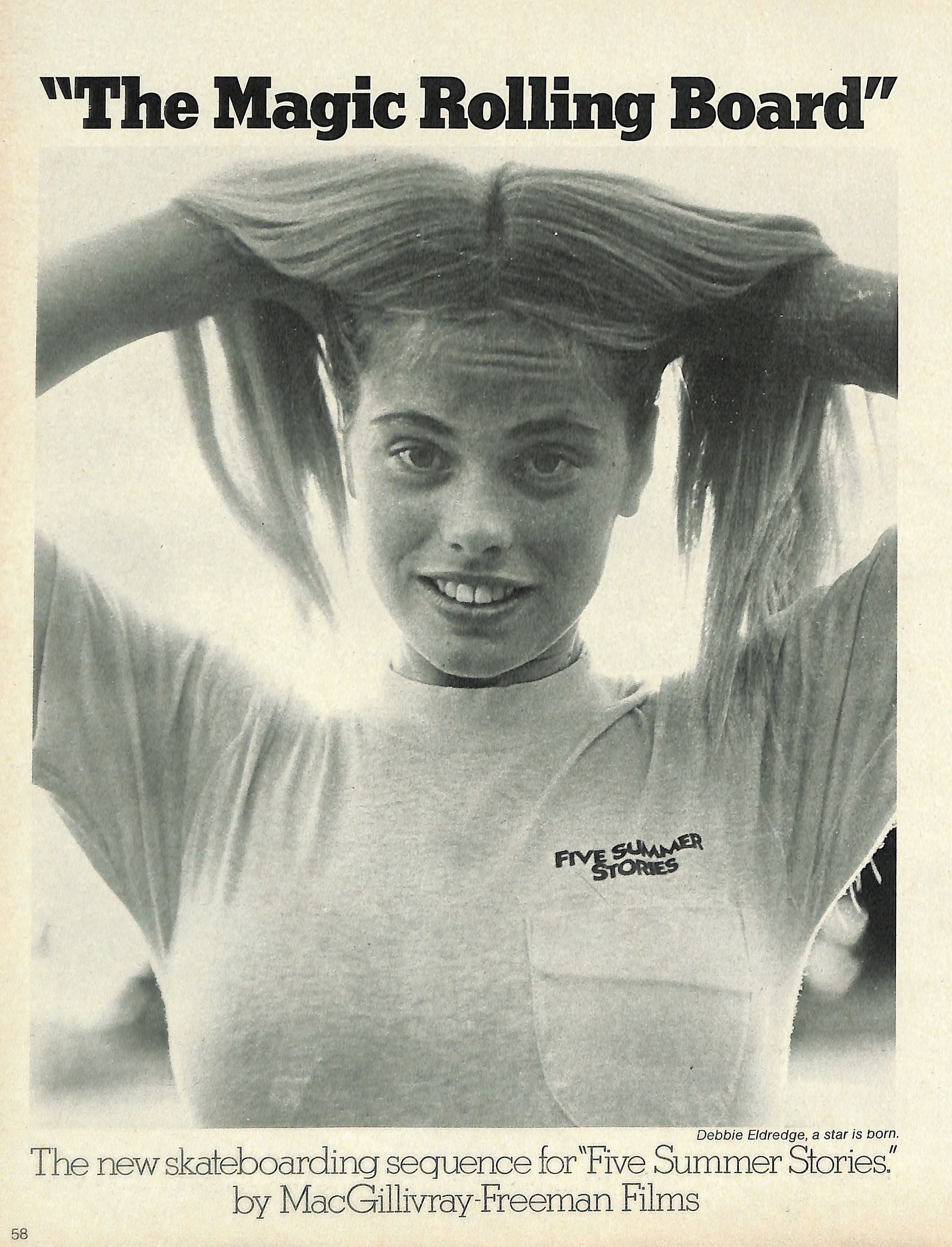 Debi was part of a 1976 feature called “The Magic Rolling Board” which was included in the “Five Summer Stories” surfing film, directed by Jim Freeman and Greg MacGillivray, although the footage is more intent on showcasing her flowing blond hair than actual skateboarding performance.