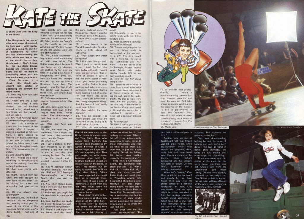 Thea also received more focused attention by Kate Mahony who was the writer behind the “Kate the Skate” column in the UK magazine Skateboard Scene. Within the March 1978 issue, Thea is celebrated. It was written that, “Thea, who comes from London, has recently been snapped up by Lovely Florence of Skate 2 who manages the Logos team… Thea started out by going to watch Seth at Skate City, then Bobby Gillam (Logos) suggested she might help as a marshal there. From there it was a case of borrowing a board from any one who could spare his precious possession for a couple of hours” (Mahony).