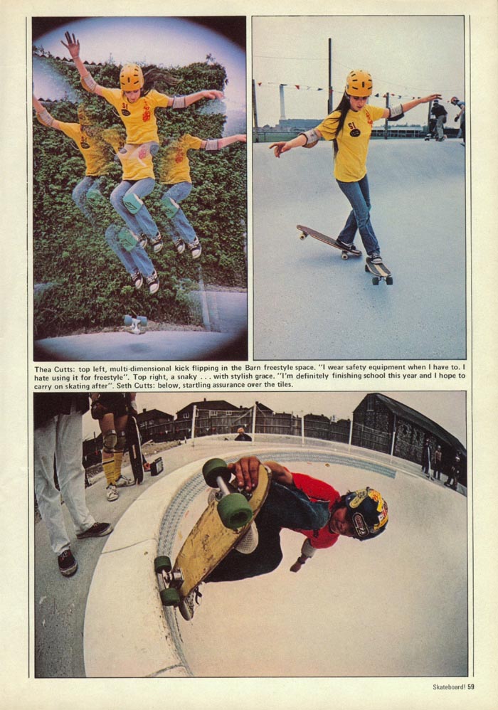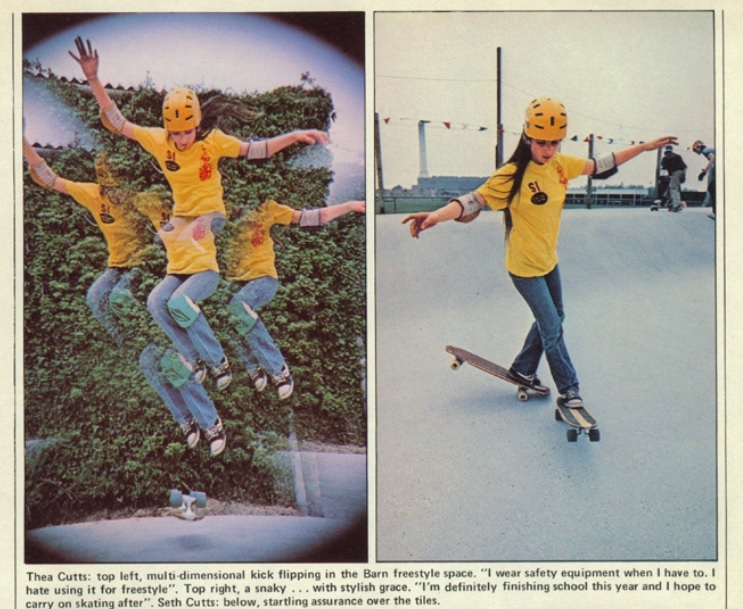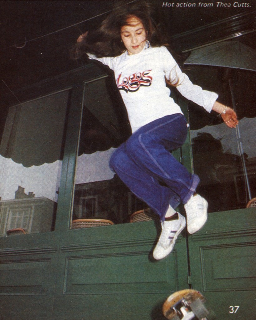 Thea Cutts was a British skateboarder in the 1970s, who not unlike Robin Logan and her brothers, didn’t receive the same amount of limelight compared to Seth and Shane, although it was Seth who introduced skateboarding to his older siblings by inviting them to Skate City (London’s first skatepark). In the Skateboard Special newsprint (Issue 22, July 1978) there’s an article called “Logos Team Interview.” Thea appears in the group photo (misspelled as ‘Theo’) and the introduction alludes to there being a girls’ team, and yet, all the other skaters are featured with a bio except her.