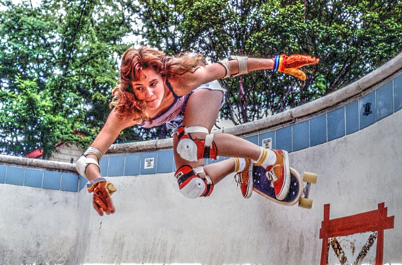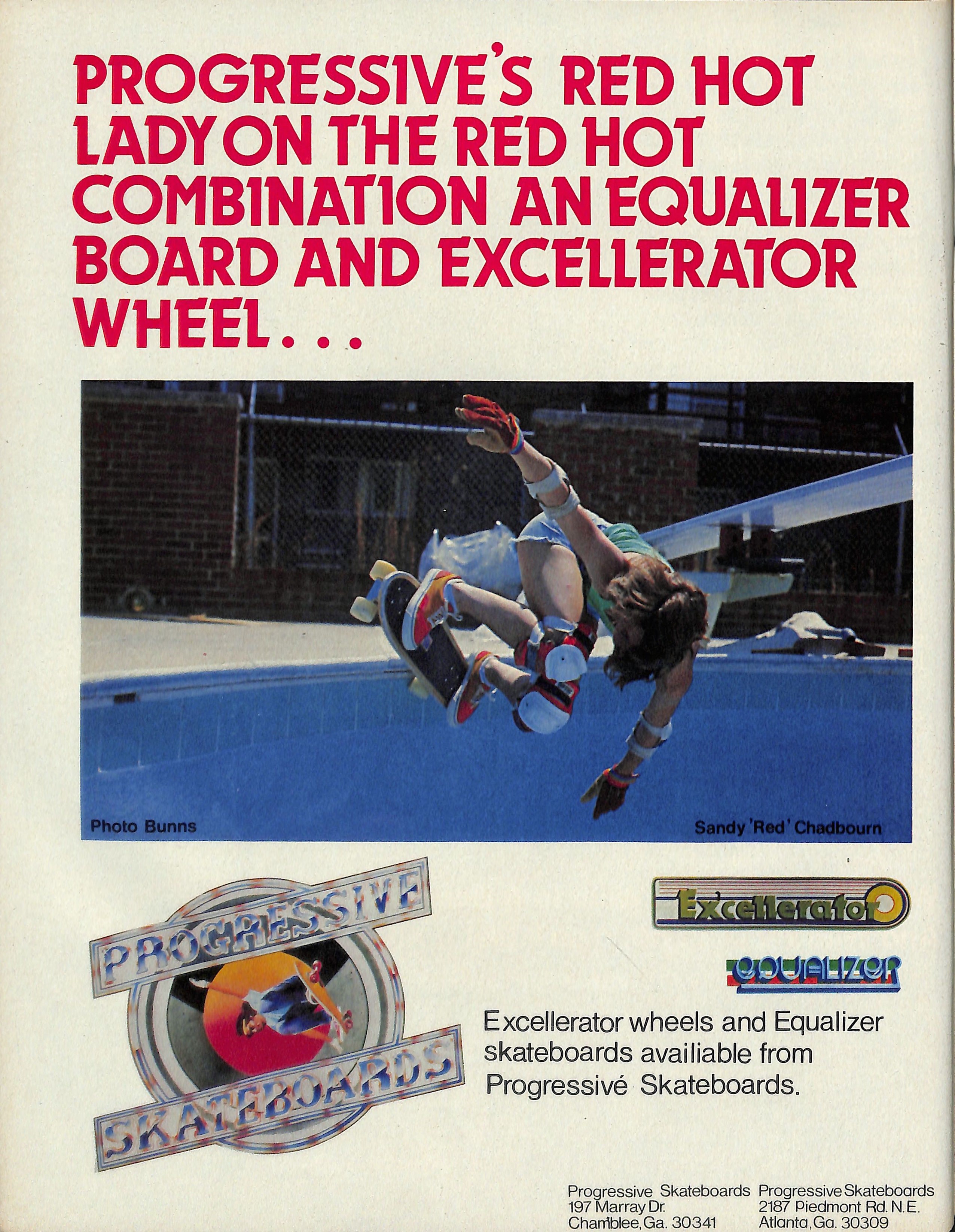 Sandra “Red” Chadbourn was a ripping skateboarder in the 1970s based out of Atlanta. She became sponsored by the best team around called Progressive Skateboards, which was the very first dedicated skate shop in Atlanta, initiated by Mike Maloof. Progressive had its own boards and innovative wheels for the time called the “Excellerator.”