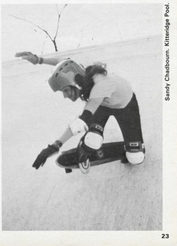 Sandy even appeared in an ad for Progressive in the July 1978 issue of Skateboarder magazine, with the photo taken by Tim Nunn. The pool was called “The Blue Room,” and she also skated the long-gone Mansion pool and a popular, yet gnarly pool called Kittredge in North Druids Hills. A photo of her at Kitteredge appeared in the east coast magazine Skate Rider in the Summer 1978 issue.