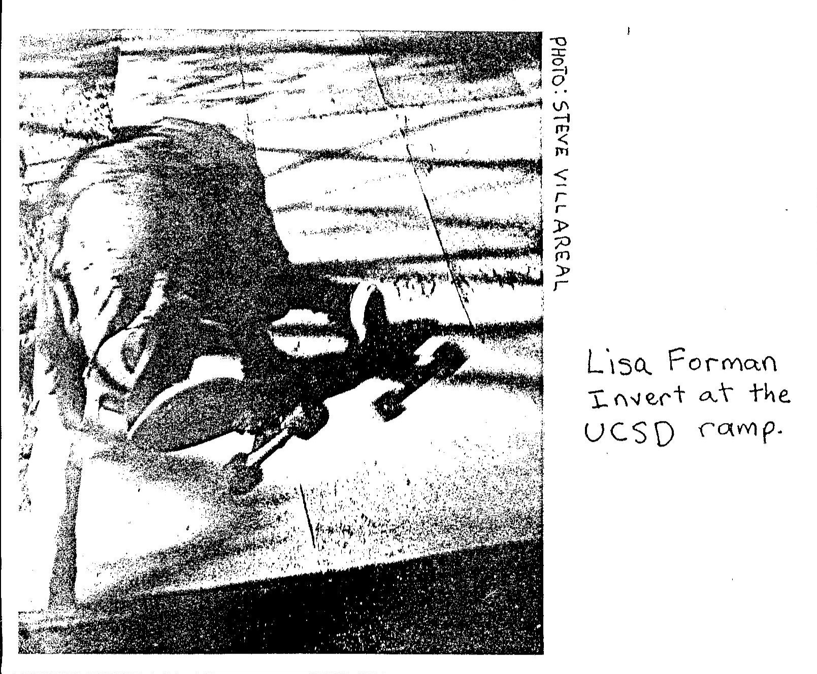 Kramer’s first zine Girls Who Grind was her early attempt at rallying members of the Women’s Skateboarding Club, and Lisa was one of the first members. It’s reported that, “On November 19, 1988, Street Life held an amateur streetstyle contest in San Diego, CA. Included in the contest was a women’s division. Five women showed up to skate that day, and skate they did… Lisa Forman placed second. This was Lisa’s first streetstyle contest; her first love being the Masonite transitions on a great big, vertical, ramp. Lisa pulled sweepers, an invert, foot plants on the quarter pipe, and almost pulled off a frontside wallride. Lisa is backed by the UCSD ‘Ready to Shred’ skate club.”