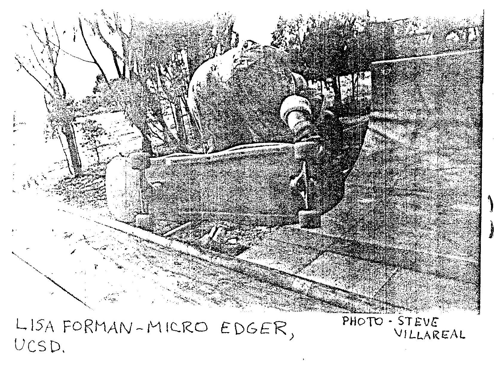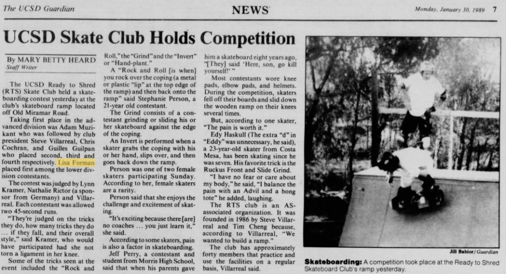 In an article within The UCSD Guardian on Monday, January 30, 1989 it was reported that there was a contest on the campus ramp with Advanced and Intermediate divisions. “Lisa Forman placed first among the lower division contestants. The contest was judged by Lynn Kramer, Nathalie Rictor [Richter] (a sponsor from Germany) and [Steve] Villarreal.” Pro skater, Stephanie Person was also present and noted how female skaters were a rarity.