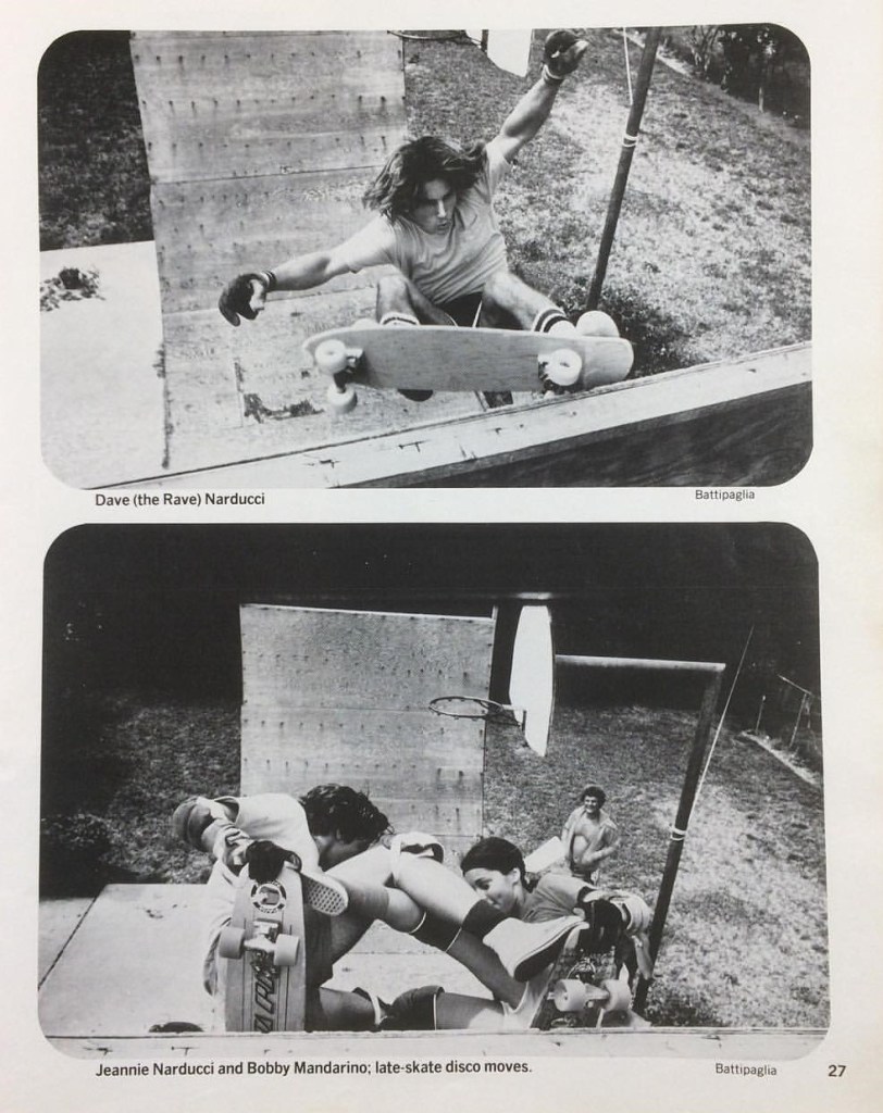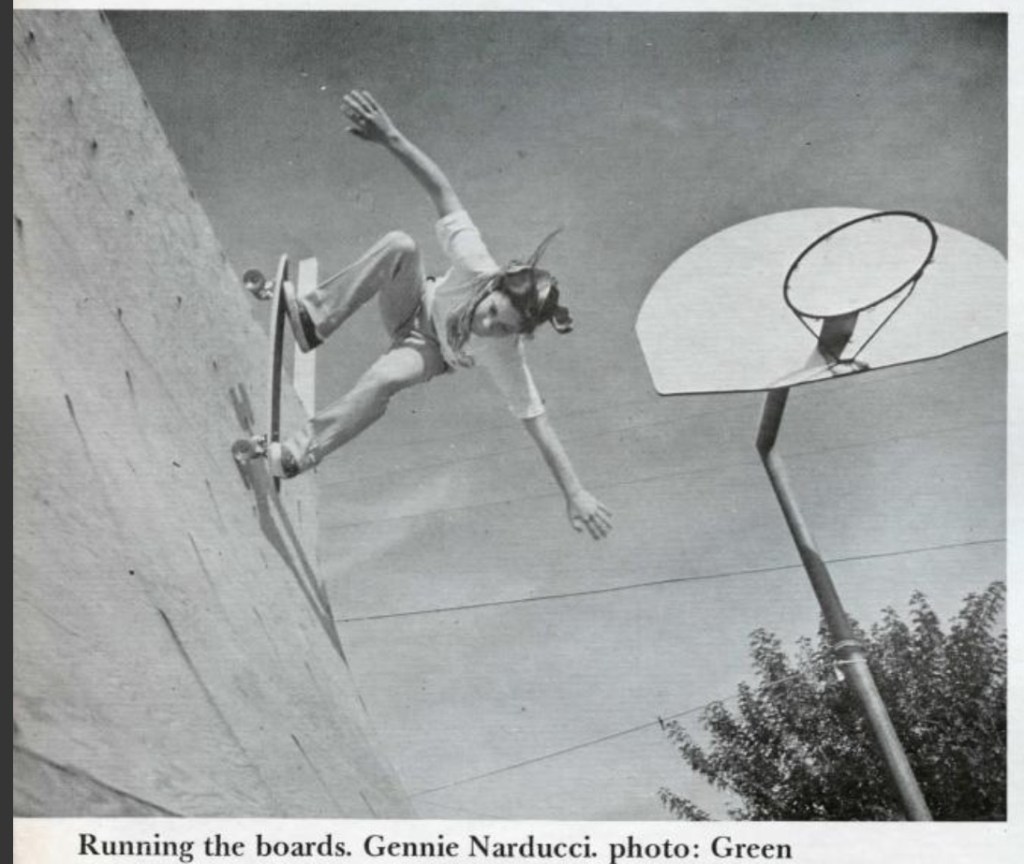 Jeannie appeared in the East Coast magazine called Skate Rider within issue No 3 (Winter/Spring 1978) ripping up a plywood ramp, with the photo taken by Mike Green. It looks like the Narducci’s had their own mini-ramp in their backyard at Ormond Beach, but without a top deck!