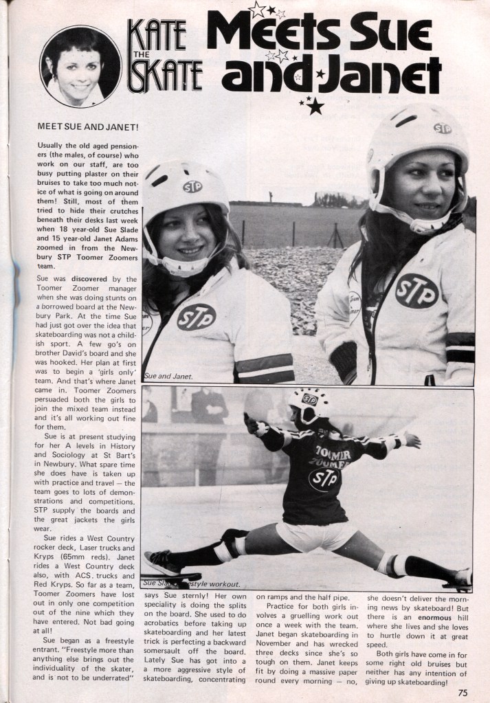 Kate began her June 1978 column heckling her male co-workers that they were a bit clueless of what was going on around them, until 18-year-old Sue Slade and 15-year-old Janet Adams appeared from the “STP Toomer Zoomer” team! Sue had originally wanted to form a girls only team, but the friends were persuaded to be sponsored by STP and compete in freestyle. Sue was known for her flexibility, doing the splits on two skateboards, but soon discovered the joys of skating the half pipe.
