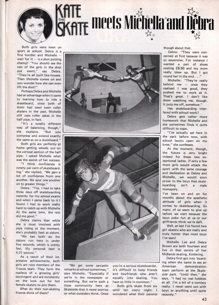 The last article is from August 1978, again featuring two athletic friends who motivated each other. Michelle Lee and Debra Brown took up skateboarding after being avid roller skaters and witnessing a demonstration from an American team. They were soon hooked, practising for four hours every night, and loved hitting vert in their local halfpipe called Skateside in Kettering. Debra shared that, “We gain a lot of confidence from one another. We spur one another on to greater things.” The two were sponsored by Yowza and were receiving coverage in their local newspaper.