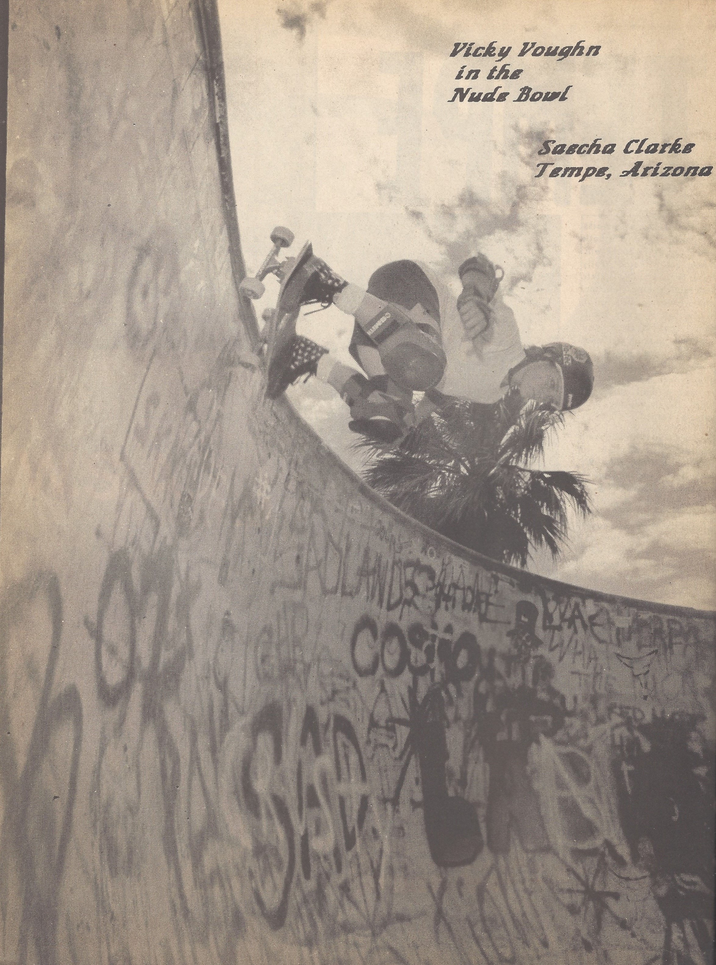 Vicky Voughn is currently a mystery, possibly spelled “Vicki.” All I know is that she appeared in April 1989 to compete in the mini-ramp contest in Tempe, Arizona and was included in Lynn Kramer’s zine Equal Time (Vol. 1, No 3). Lynn reported that, “Vicky showed up in yet another uncommon place, using the whole ramp for big backside grinds. She also did this neat slide to fakie.” Vicky was third behind Lisa Forman (1st) and Danielle McDade (2nd).