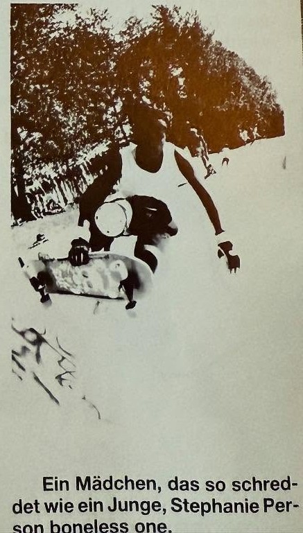 Stephanie was inspired to travel to Europe after meeting some welcoming German skaters at the Expo event in Canada. There’s even a photo of her in the German magazine called Monster Skateboard from the December 1986 / January 1987 issue, #24 of her launching a boneless, with the caption stating that she shreds just like the guys.