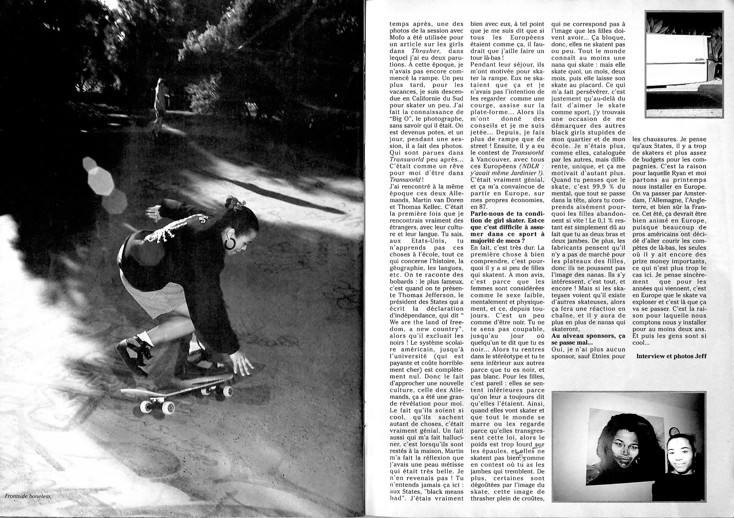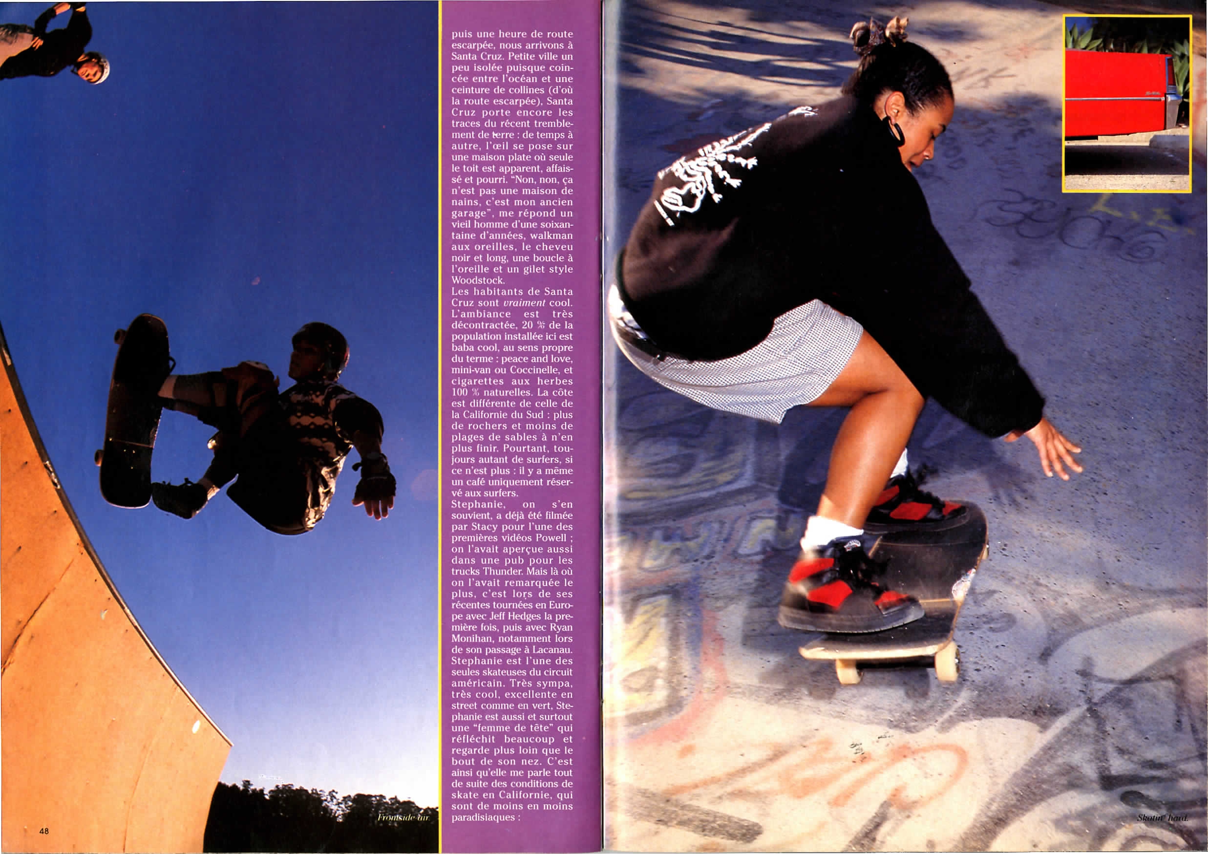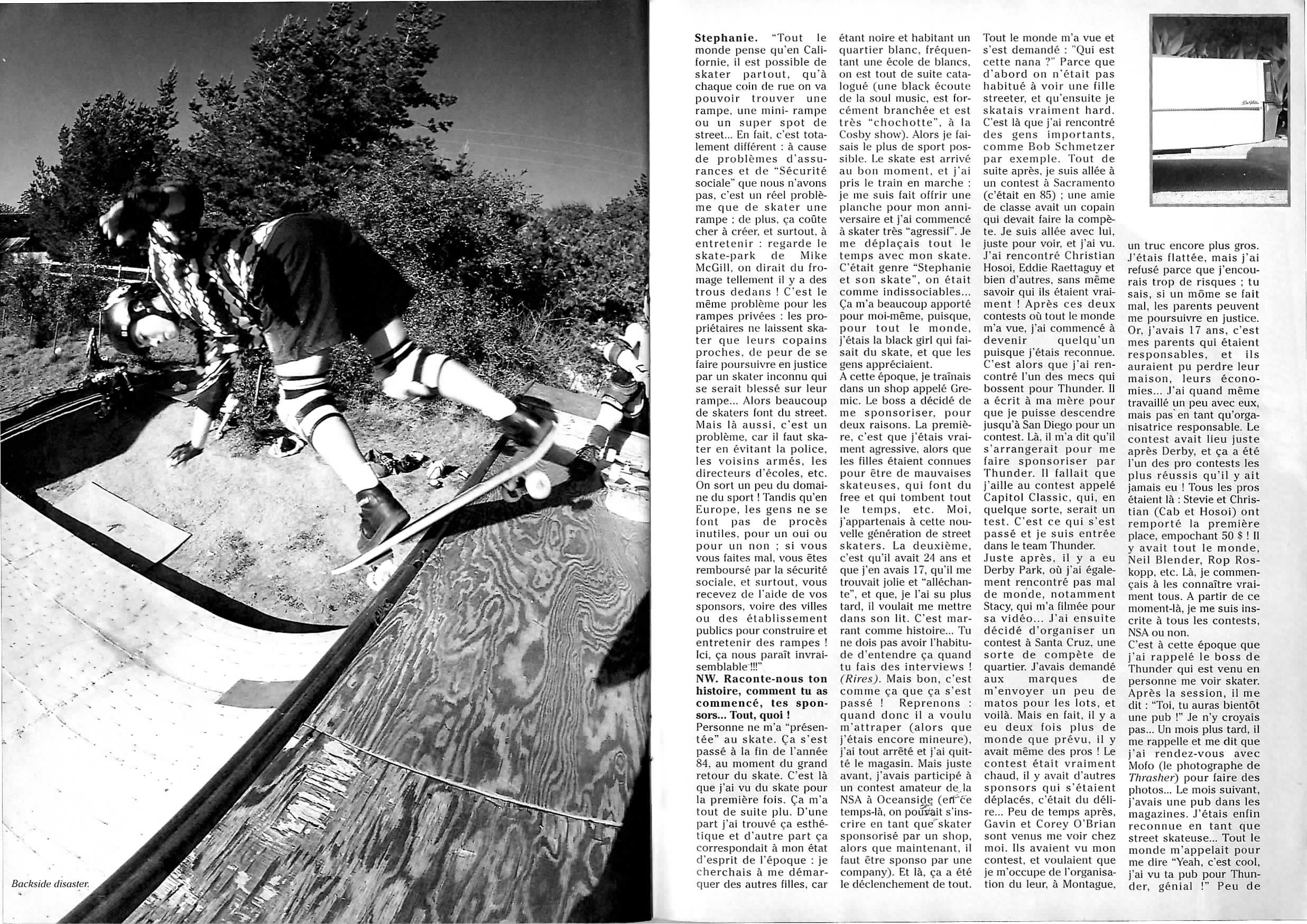 Above: an interview in the French skateboard magazine Noway from May 1990, when Stephanie is back living in Santa Cruz, but preparing for a return to Europe.