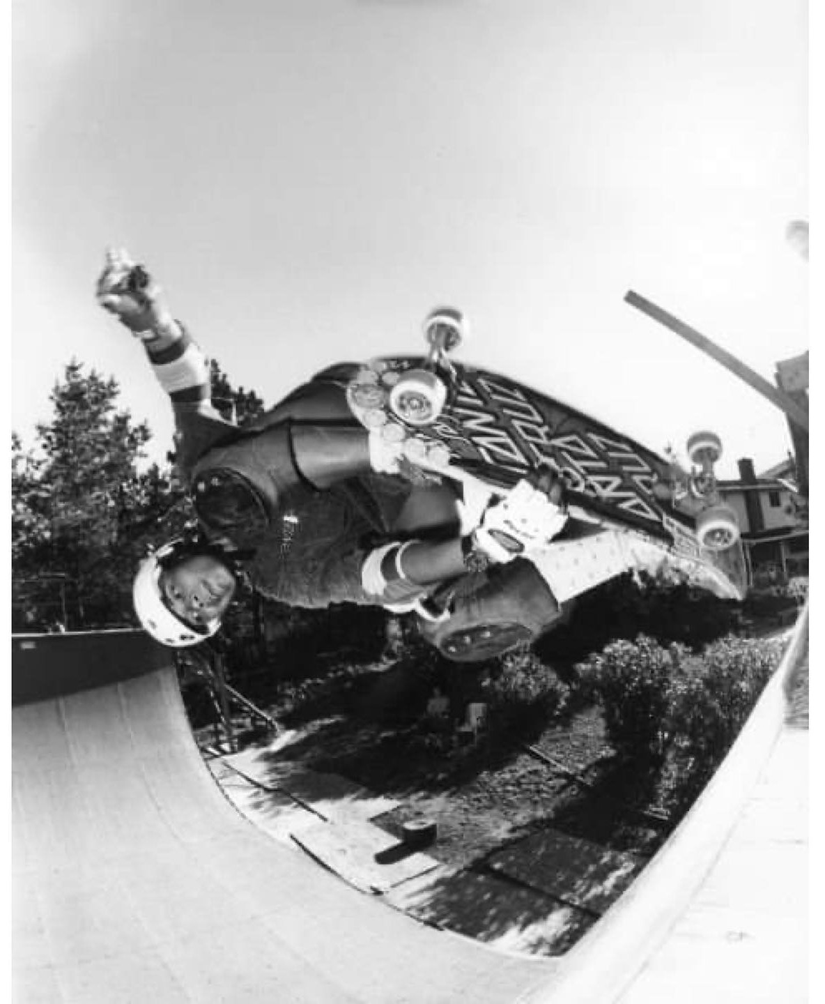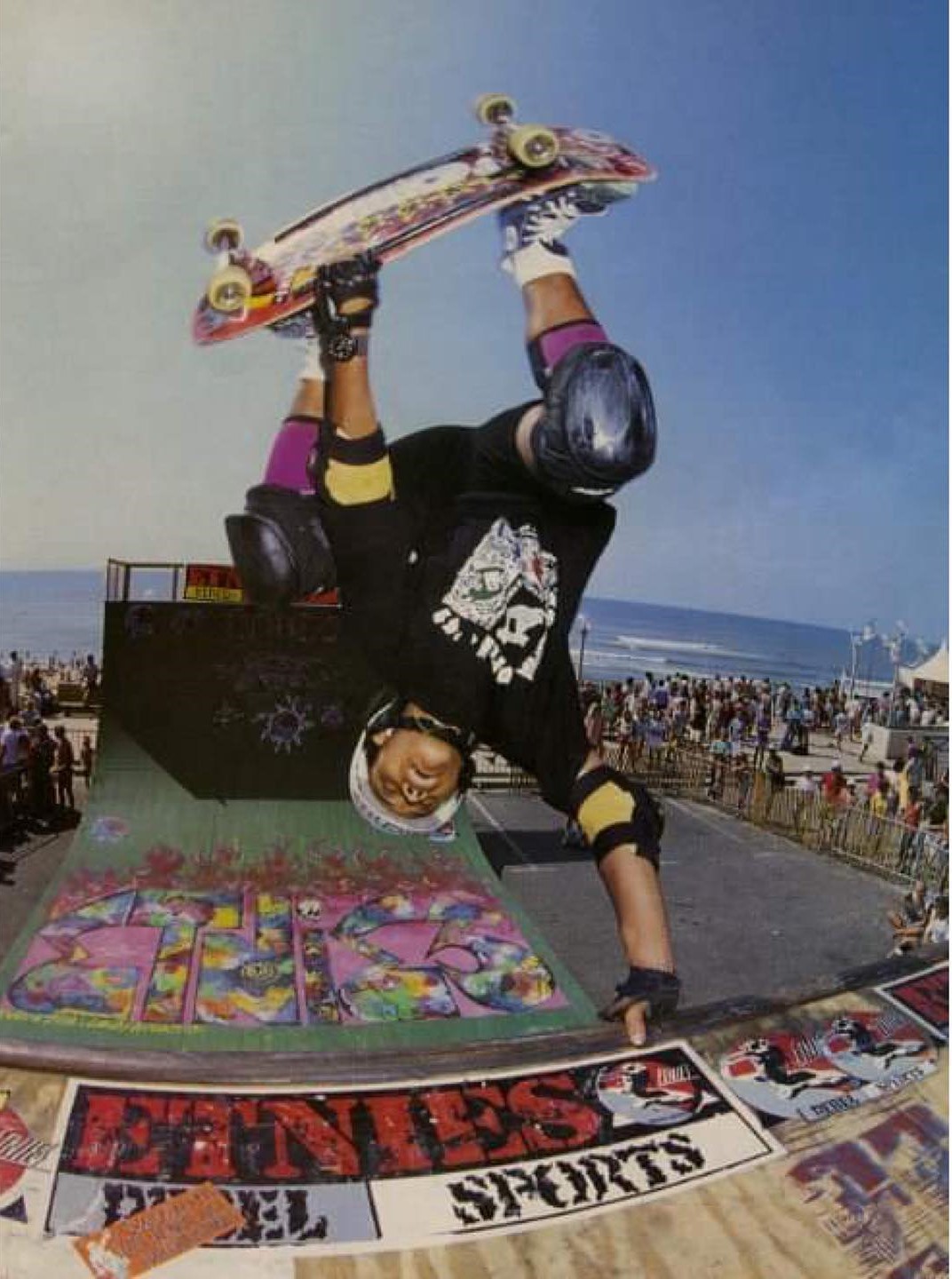 Stephanie also gave props to legendary skater Judi Oyama and explained how, after turning down a pro model from Brand-X, she was approached by Judi at Derby Park who said, “‘You should be sponsored by Santa Cruz.’ I was like, ‘You think?’” (Pastras). Judi went on to recommend Stephanie to Bob Denike, who lived down the street from her, and he confirmed that Stephanie ripped! A call was made to Richard Novak and then Santa Cruz was official when Stephanie was 19 years old. Shoe sponsors Converse and Etnies also stepped up to support Stephanie.