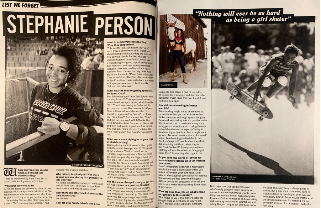 - Pastras, Chris. “Lest we forget: Stephanie Person.” Thrasher. September 2020.