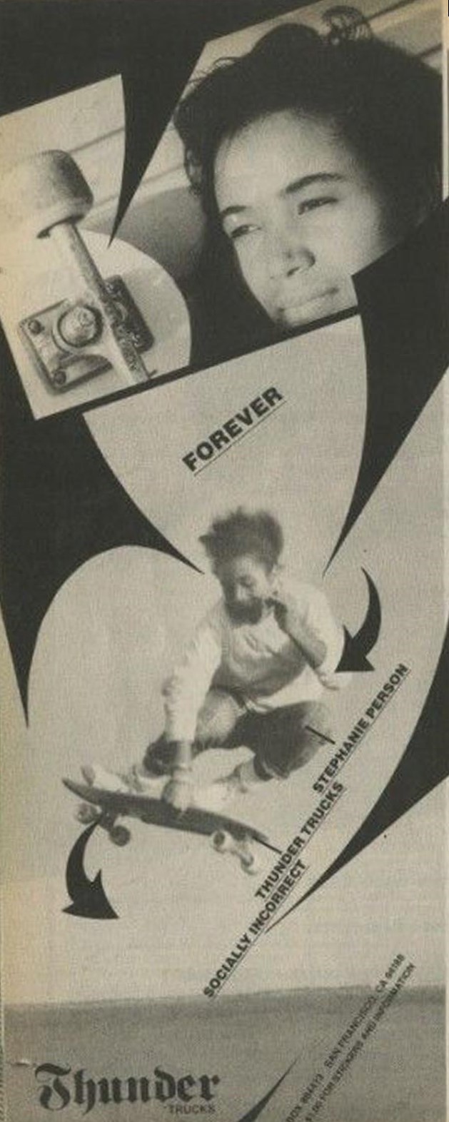 In the French magazine, Noway Stephanie recounted her excitement after being photographed by Morizen Foche (aka MoFo), which resulted in a Thunder trucks ad featuring Stephanie for the February 1986 issue of Thrasher. Stephanie noted that it was a huge deal for her. “I was like, Oh my God, that’s me in the magazine! I went to Go Skate, a shop in Santa Cruz, and this kid opened up the magazine and was like, ‘That’s you, isn’t it?’ And I almost started crying. In her article, Cindy Whitehead tried to emphasize how unheard of it was for a company to choose a female rider to represent them in a Thrasher ad. This was huge!