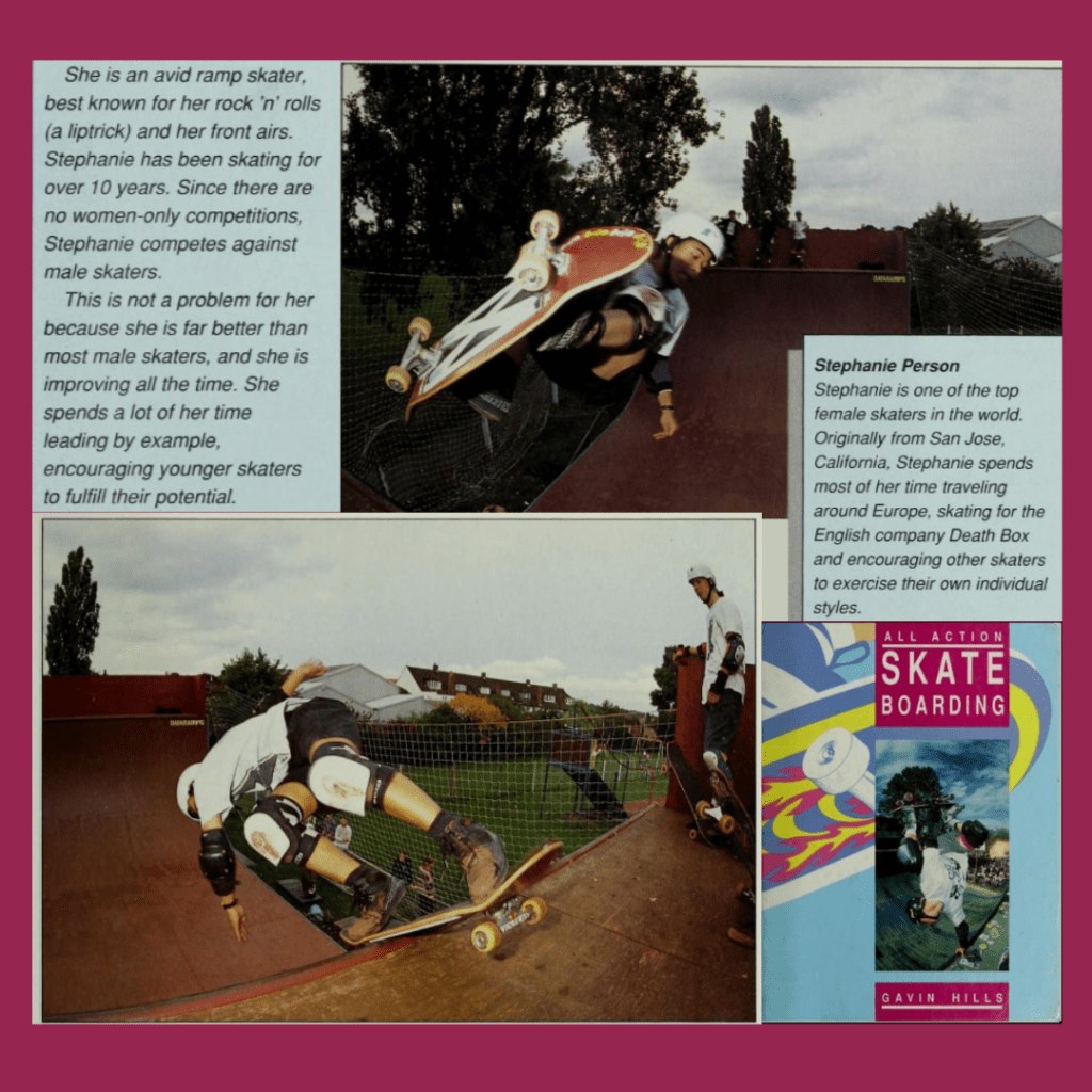 In this 1993 book Skate Boarding by Gavin Hills, intended for school children, the caption reads: “Stephanie spends most of her time traveling around Europe, skating for the English company Death Box… Since there are no women’s only competitions, Stephanie competes against male skaters. This is not a problem for her because she is far better than most male skaters, and she is improving all the time.”