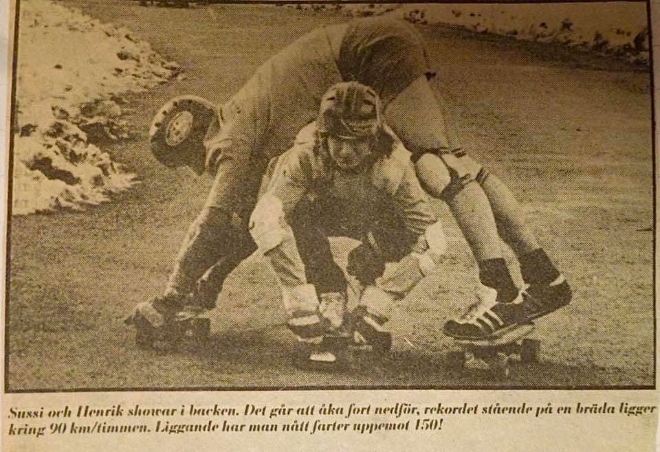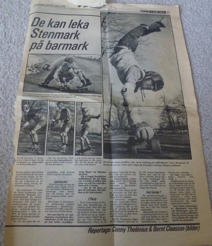 Sussi Berglund (Mabbe) of Stockholm, Sweden was skateboarding in her teens and even appeared in a local newspaper performing a handstand in 1978 at age 16, evidently having a great time along with friend Henrik.