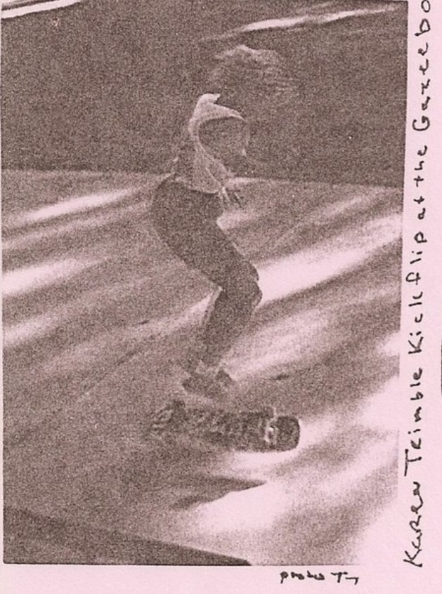 Karen Trimble of San Marcos, CA was a competitive freestyle skateboarder in the mid-1980s along with her brothers John and Terry. She was mentioned in passing within Terry’s Freestyle zine called GTurn and he published a photo of her practising kickflips in the November 1987 issue (Vol. 1 No. 2).