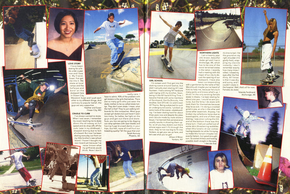 But female skateboarders always existed and would not idly step aside. After an onslaught of letters, Thrasher magazine stepped up in their February 1995 issue to feature six pages of “Girls Who Skate.”