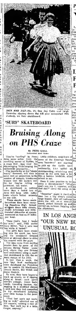 The best part is within the article by Pete Gall after he tries to explain what he’s witnessing at Pasadena High School and considers skateboarding a rival activity to hula-hooping. Gall wrote that, “The girls have been sneaking into the sport, too, braving the occasional scraped knee or skinned elbow to skim the cement with the guys.” Hell yeah, they have!
