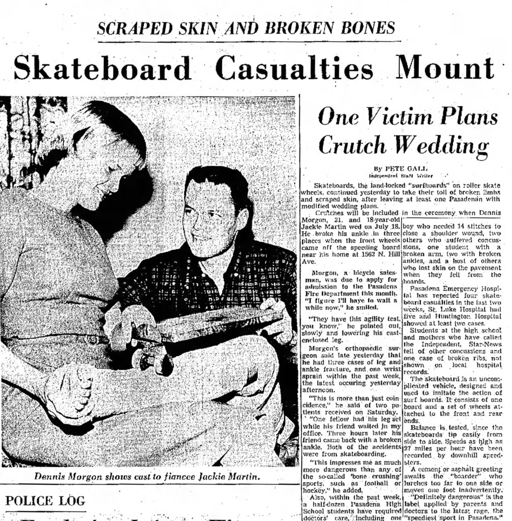 Champion surfer, Linda Benson who had her own signature skateboard with Hansen boards in the early 1960s had likely cruised around on one in the 50s, but I’ve yet to see a photo, so this is a first for me. Pete Gall’s next article in the Pasadena Independent (June 3, 1959) is a little less glowing, all about Jackie Martin (age 18!) and her fiancé Dennis Morgon (age 21) who broke his leg skateboarding a month before their wedding.