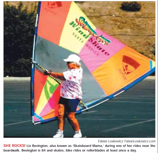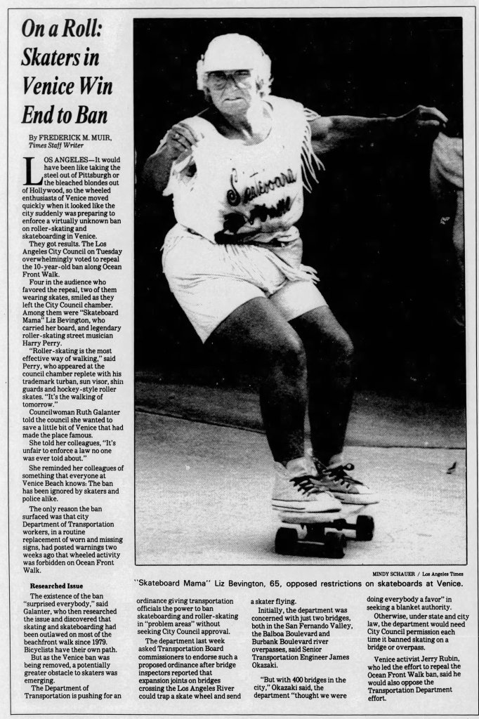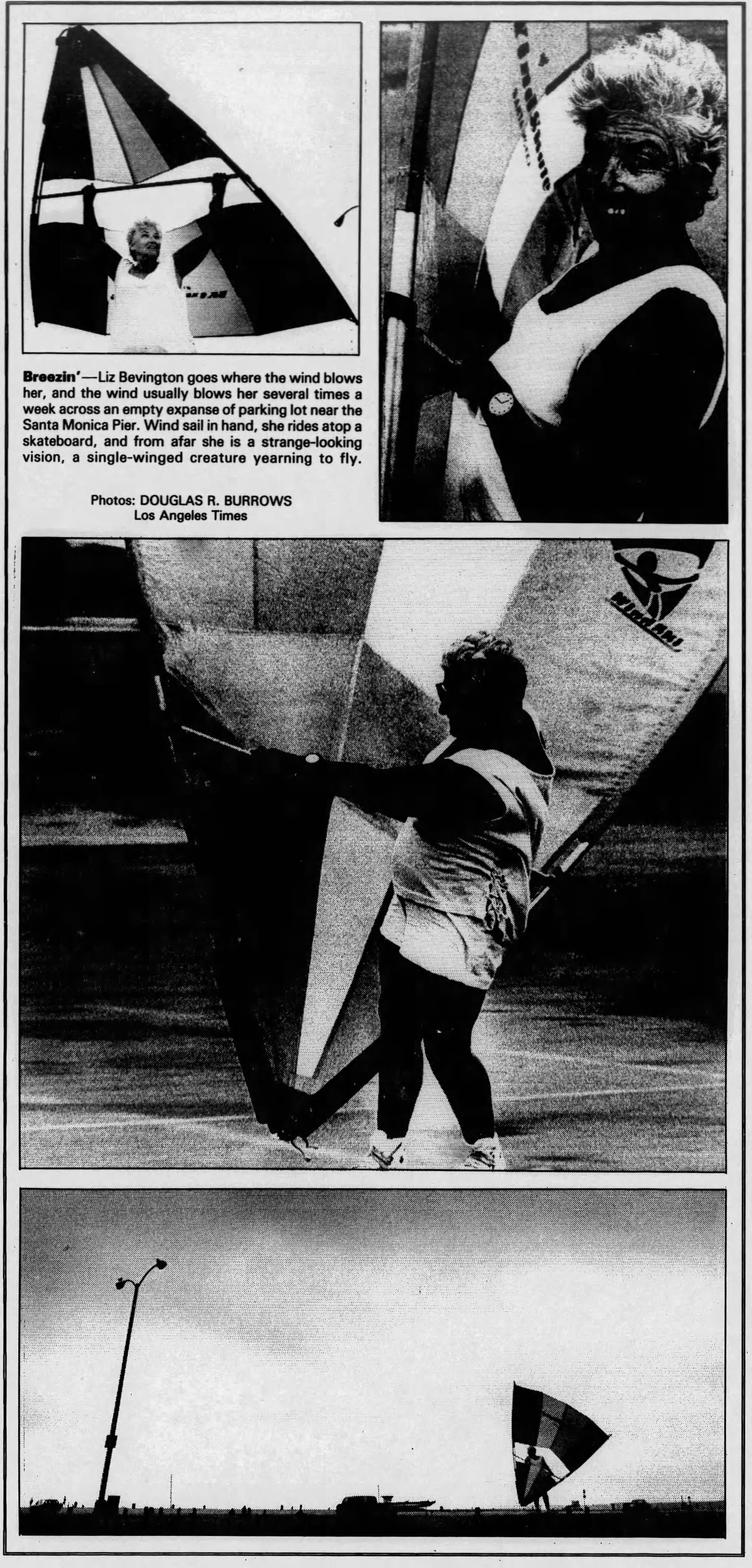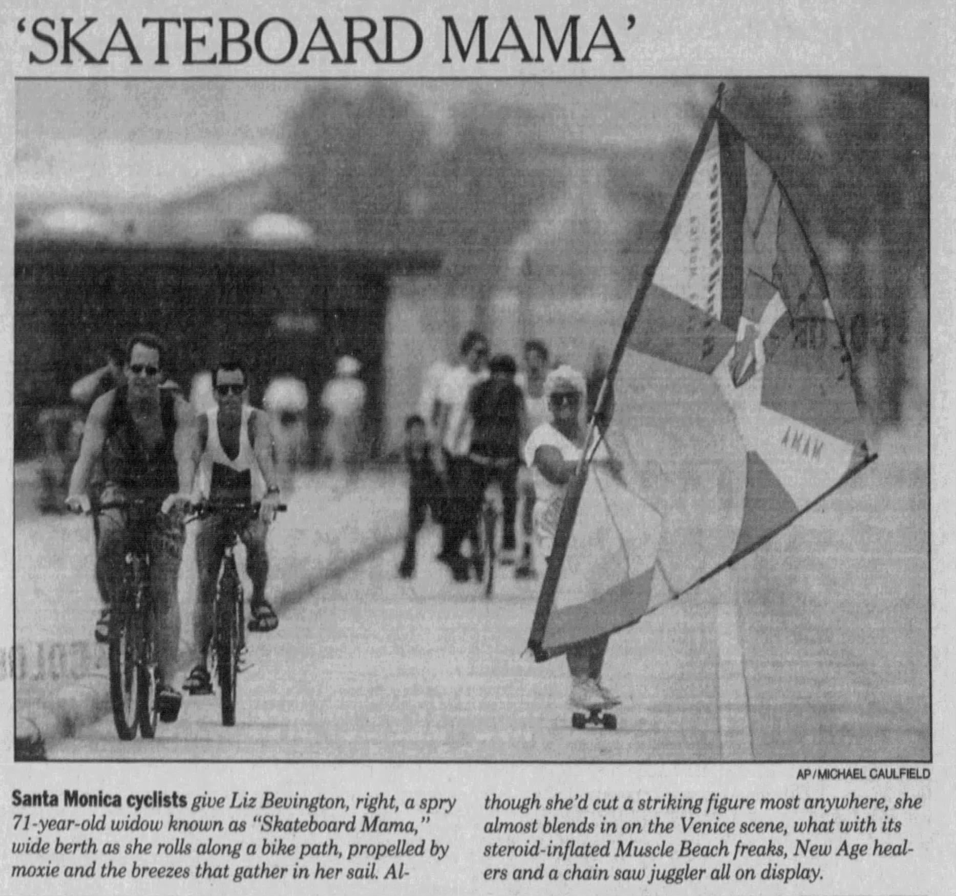 In 1989, at age 65, Liz featured in a photo by Mindy Schauer for the Los Angeles Times (May 31, 1989) in a story about the city’s attempt to impose a roller-skating and skateboarding ban in Venice, which would have been ignored anyways. A month later (June 22, 1989), Douglas R. Burrows snapped a few photos of Liz for the LA Times, on her skateboard / windsurf set-up, ripping around a parking-lot near the Santa Monica pier!