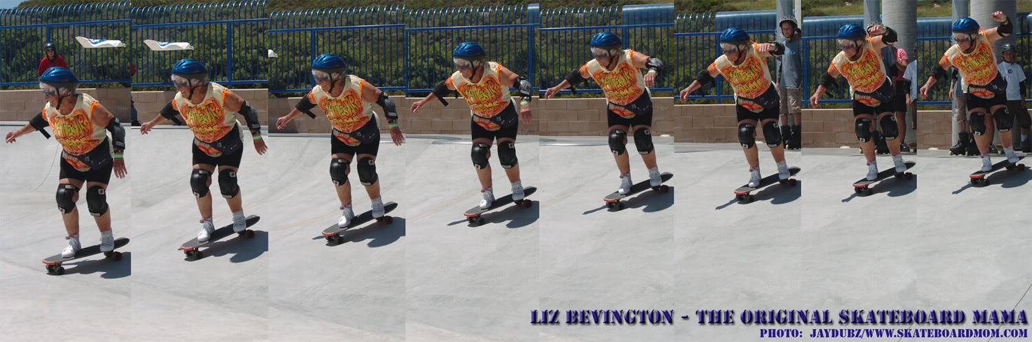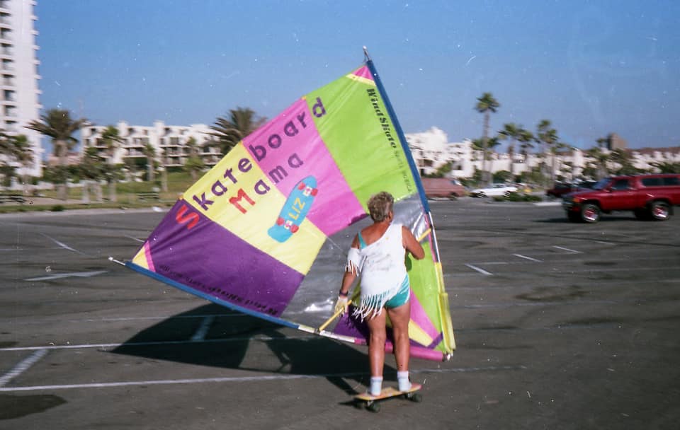 Liz would often be seen rocking pink high tops, wearing a tasseled “Skateboard Mama” beach t-shirt while riding her custom skateboard with a windsurfer sail for extra speed.