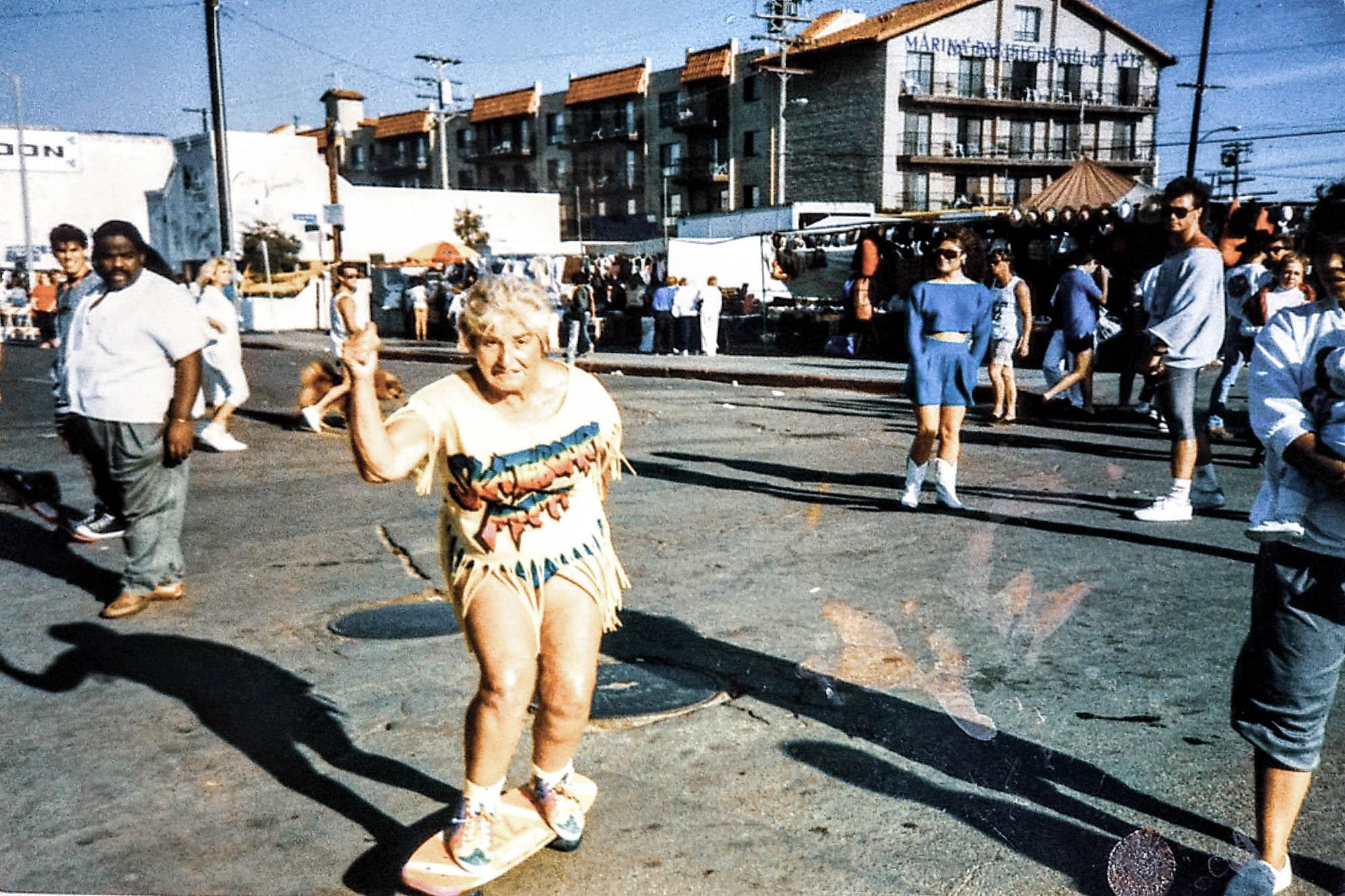 Liz Bevington (RIP) was renowned and beloved as an eccentric Venice Beach local nicknamed “Skateboard Mama,” with a passion for skateboarding and kite skating. Liz was born in Germany and began skateboarding the boardwalk at age 52 in 1976. According to an article called “Widow rides the Boardwalk” (Associated Press) from August 1995, she loved being part of the Venice carnival.