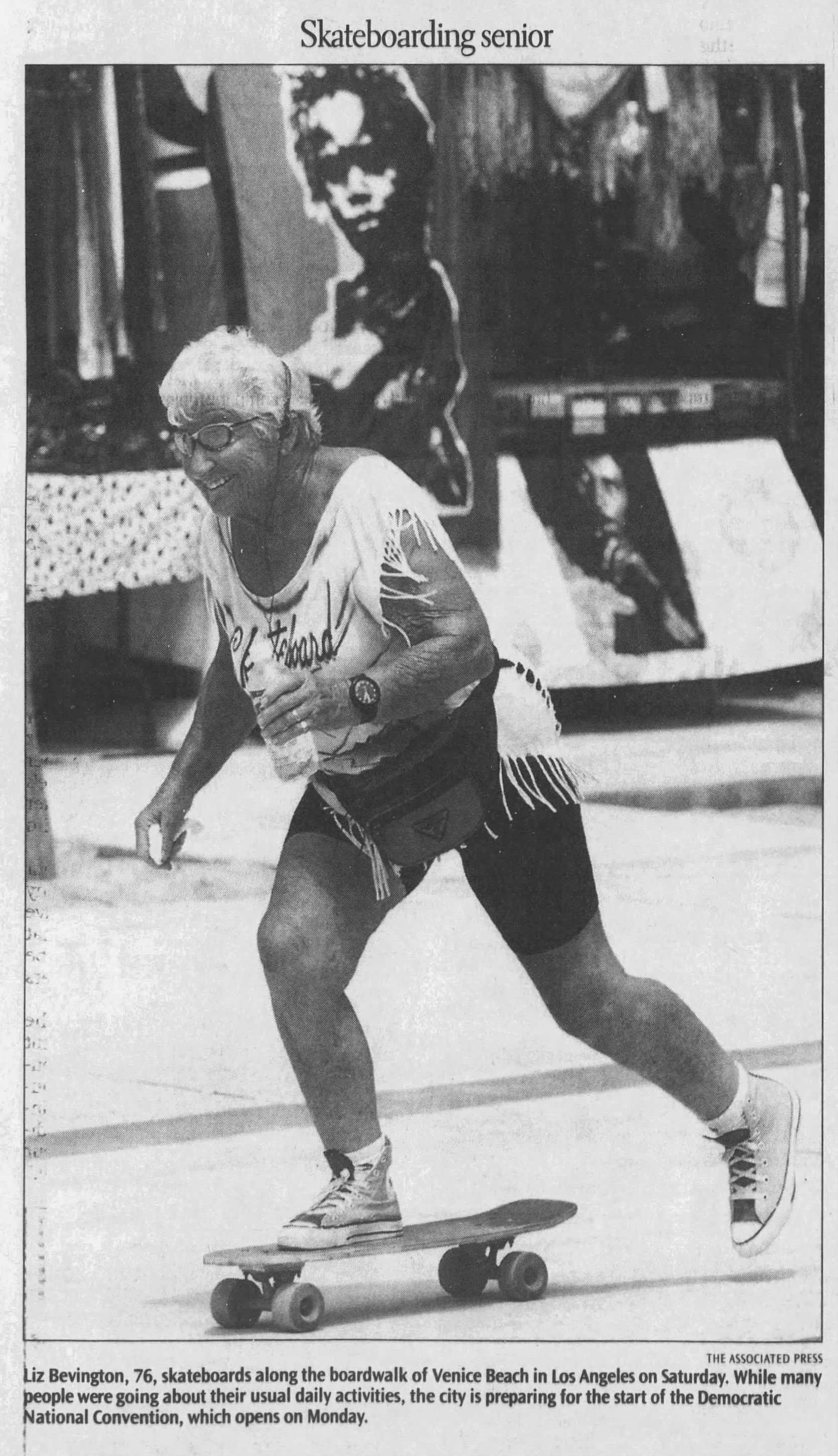 It also sounded like skateboarding was a really positive social outlet for Liz after her husband died in 1987, as she would often delight the tourists on the boardwalk, posing for photos. “People come from all over the world, and they take pictures like crazy. They can’t believe it, that somebody would do this at my age. I have a ball out here.”