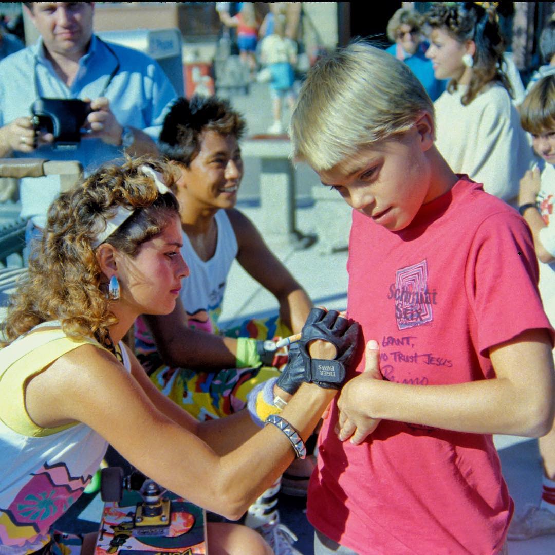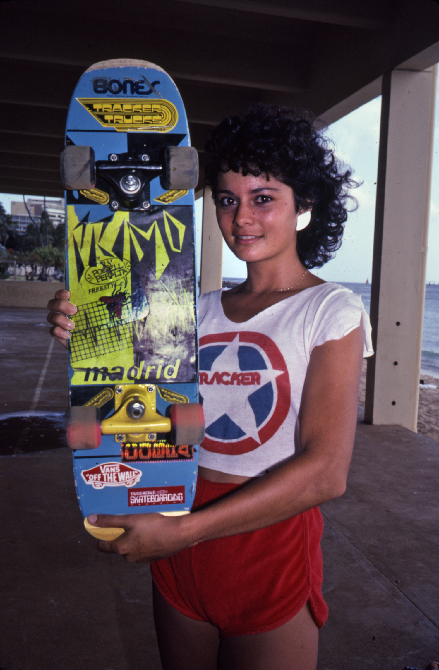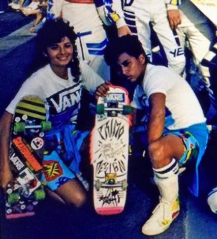 Diane (Veerman) Desiderio was a competitive freestyle skateboarder who was among very few female professionals in the 1980s. She embraced the era with big hair, big earrings, and work-out gear as a whole look, and would often perform in tandem with her husband, Primo.