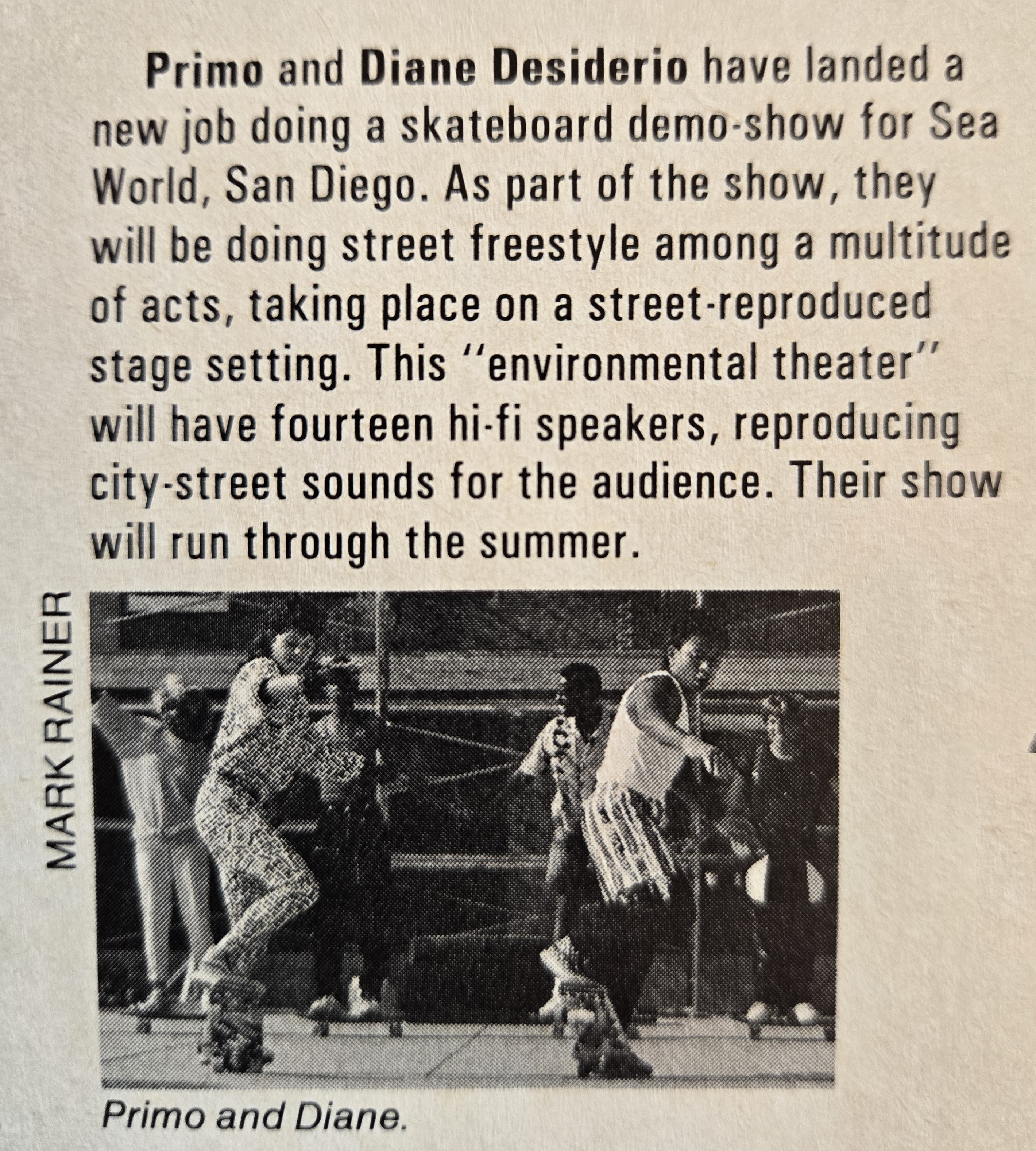 In the August 1986 issue of TransWorld, it was announced that Diane and Primo “landed a new job doing a skateboard demo-show for Sea World, San Diego” (p130). There’s a new photo (below) of Diane landing a kickflip, accompanying the announcement. Primo reported, in an interview by Terry Trimble for GTurn zine in 1987, that the couple ended up doing six demos a day in the summer, and two a day in the winter at Sea World’s “City Streets” show, which included BMX demos, dancing, and dog performances!