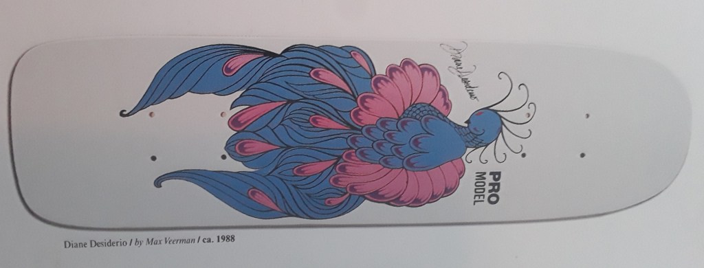 It was suggested that Diane was the only female pro skater in the world which appeared to be true in the mid-1980s until 1988 when Stephanie Person became fully sponsored, competing, and touring over in Europe. Sue Hazel was also at the top of her game in both freestyle and vert, but without a pro board. Based on Sean Cliver’s book, The Disposable Skateboard Bible (2009) on p. 327, Max Veerman designed Diane’s freestyle pro model with a cool peacock design circa 1988.