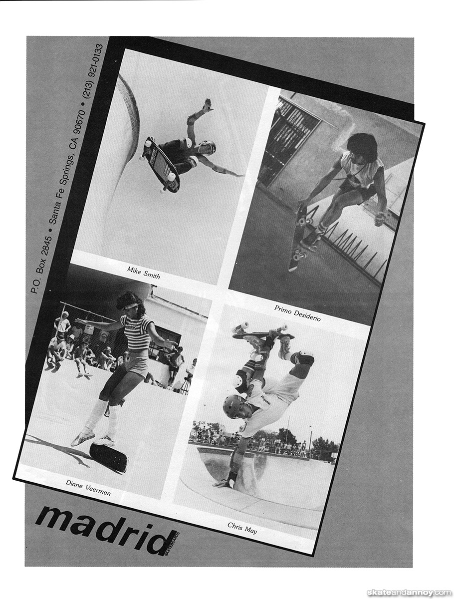 Diane was sponsored by Tracker Trucks and Madrid skateboards and was included in their ads placed in Transworld magazine (Sept. / Oct 1983) and in TransWorld (February 1984) alongside her future husband, Primo.