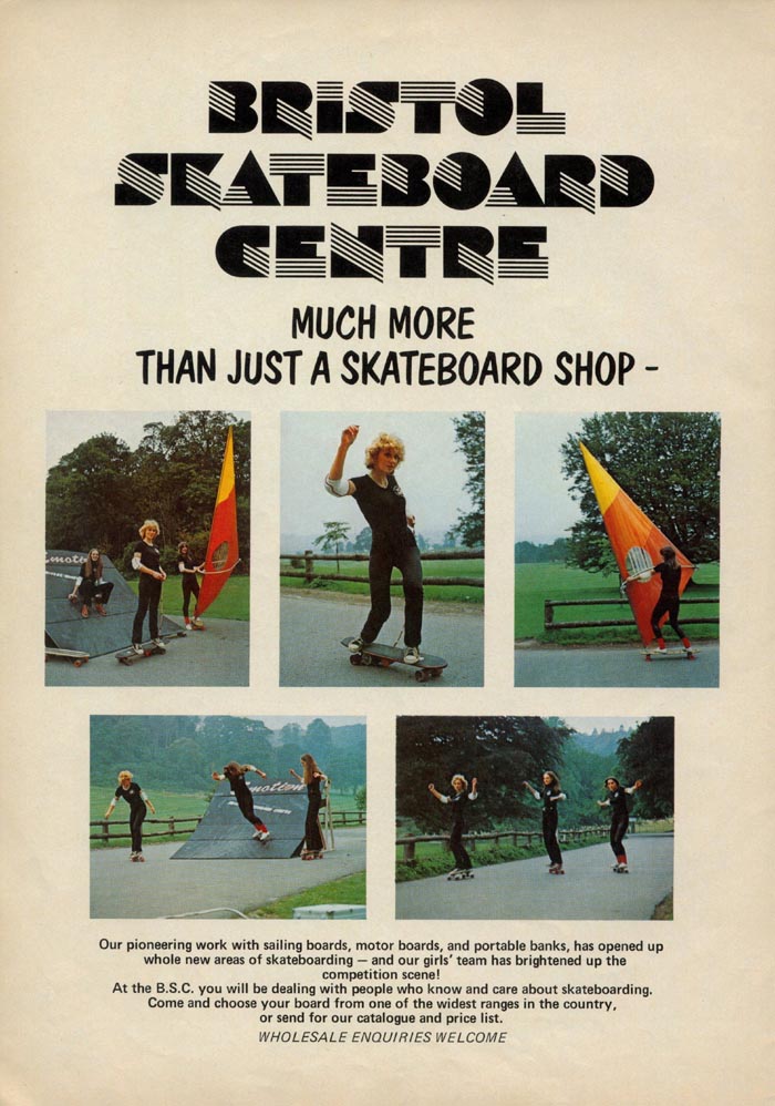 The Bristol women decided to form a team and were even featured in an ad found from the November 1977 issue of Skateboard! magazine for Bristol Skateboard Centre (“more than just a skateboard shop”). The ad shared how they were selling unusual items like sailing boards, motor boards and portable ramps and that “our girls’ team has brightened up the competition scene!”