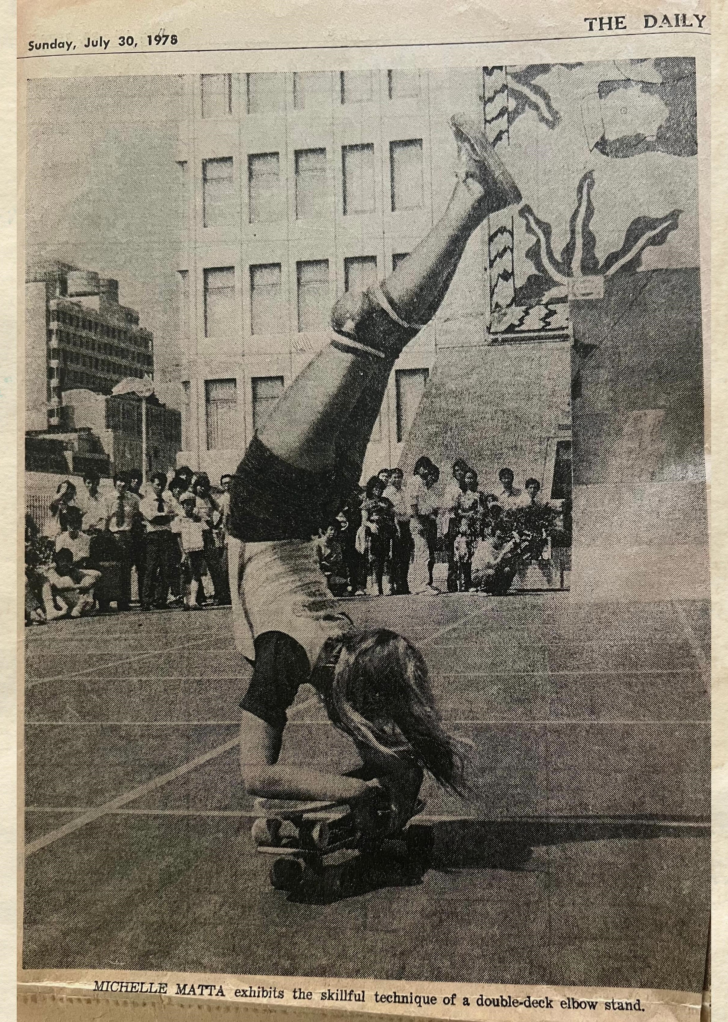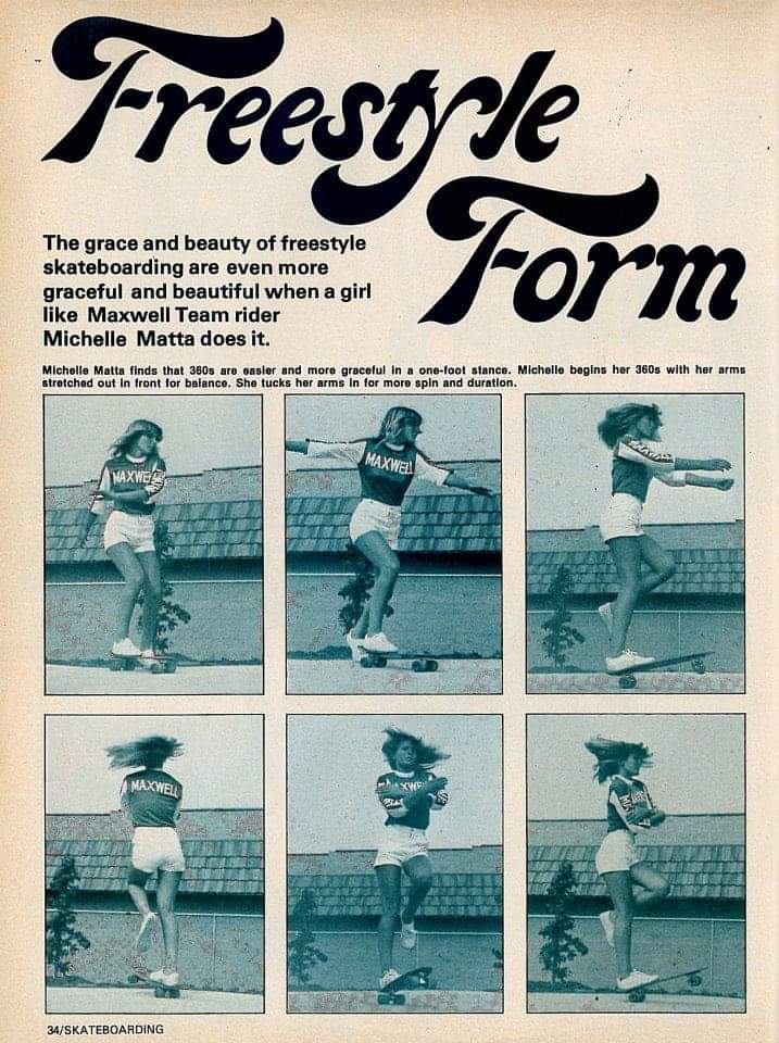 Maxwell Skateboard Team became her sponsor, and she started out performing in demos around the U.S. like Arizona. Matta wasn’t keen on slalom, preferring freestyle and bank riding. Margulies wrote that, “Until the skateparks opened, her local skating spot was a drainage run-off called Happy Hollow… Michelle would like to be well known, making some money, getting free equipment and skating on a top team. Who wouldn’t. But Michelle Matta is well on her way to getting all her wishes.”