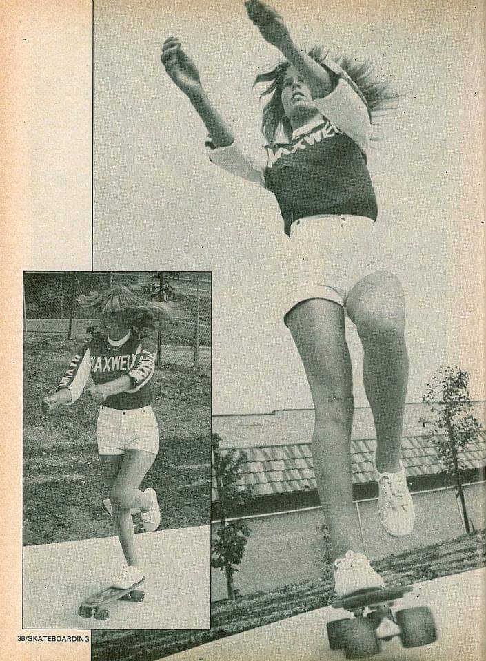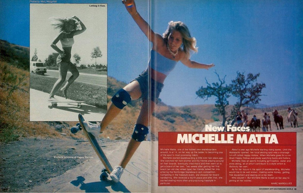 Michelle Matta (Overin) of Canoga Park near Los Angeles had a flurry of activity in November 1977 when she appeared in both Skateboard World as well as a 6-page feature in Wild World of Skateboarding magazine at age 14.