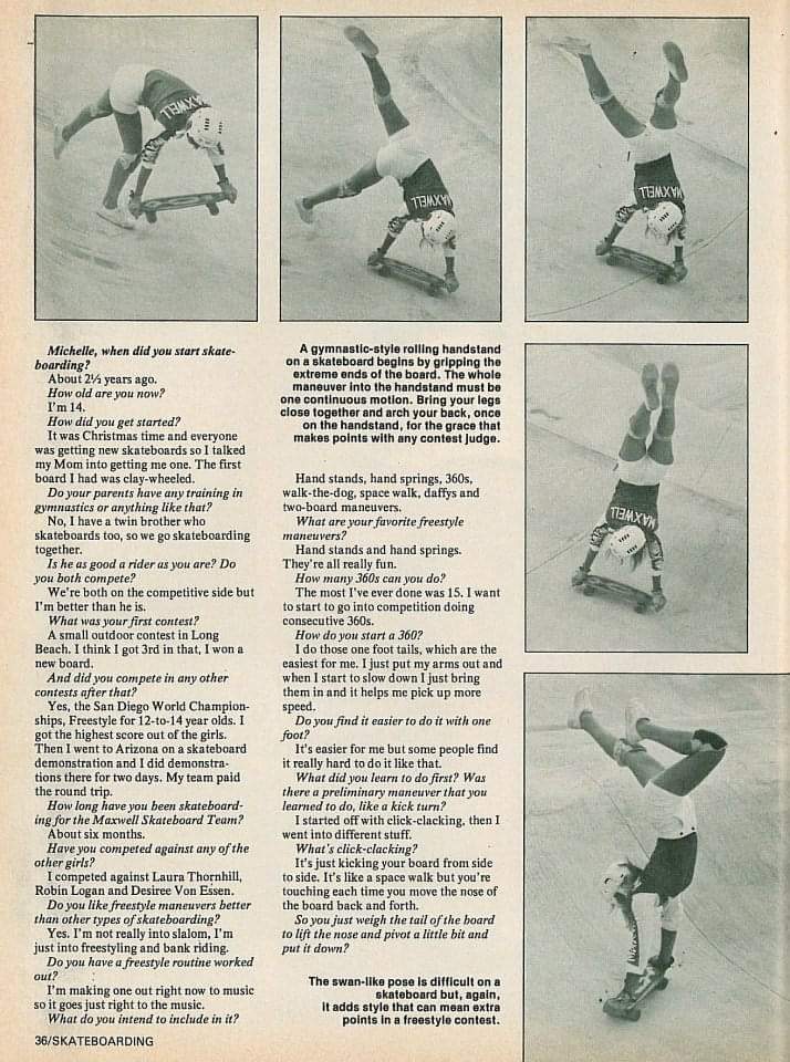 Michelle was a graceful Californian freestyle skater, riding for Maxwell and Pepsi, and while there’s emphasis on her beauty, she could hold her own performing technical skills. Her favourite tricks included “hand stands, hand springs, 360s, walk-the-dog, space walk, daffys, and two-board maneuvers.”
