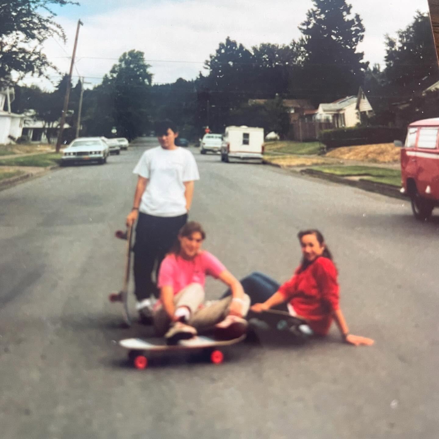 Photos: Leaf and Anita and friend, part of her Oregon skate crew in the 1980s, and getting stoked on their Powell Peralta skateboards
