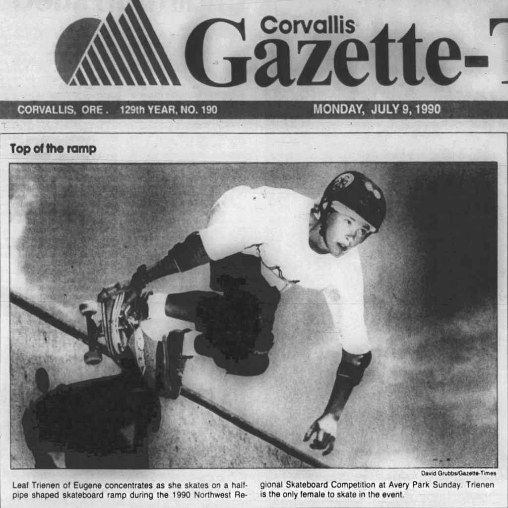 For the Corvallis Gazette Times in 1990, Leaf was celebrated for being the lone female competitor in the Northwest Regional Skateboard Competition at Avery Park on the vert ramp.