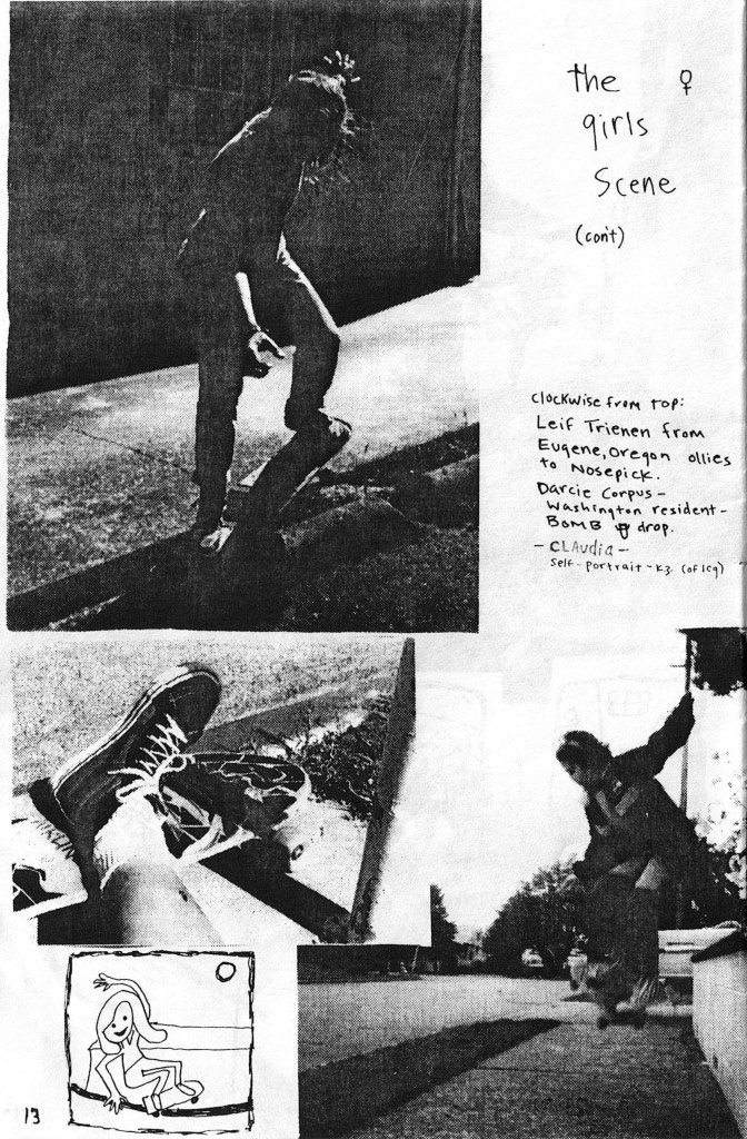 Leaf was also a contributor to KZ Zapata’s zine Push, Push Then Go! with a photo of her grinding a curb in Eugene for issue #3, which was included in “The Girls Scene” section, and a drawing for issue #4 in 1988, perhaps to help visualize her progression because Leaf was discovering she had skills on vert.