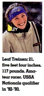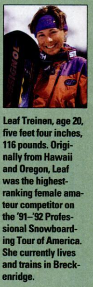 In the early 1990s, Leaf also took up snowboarding with intention and was a USSA Nationals qualifier in 1992 – 1993, living and training in Breckenridge, Colorado. She competed as an amateur and then became a product tester for Skiing magazine.