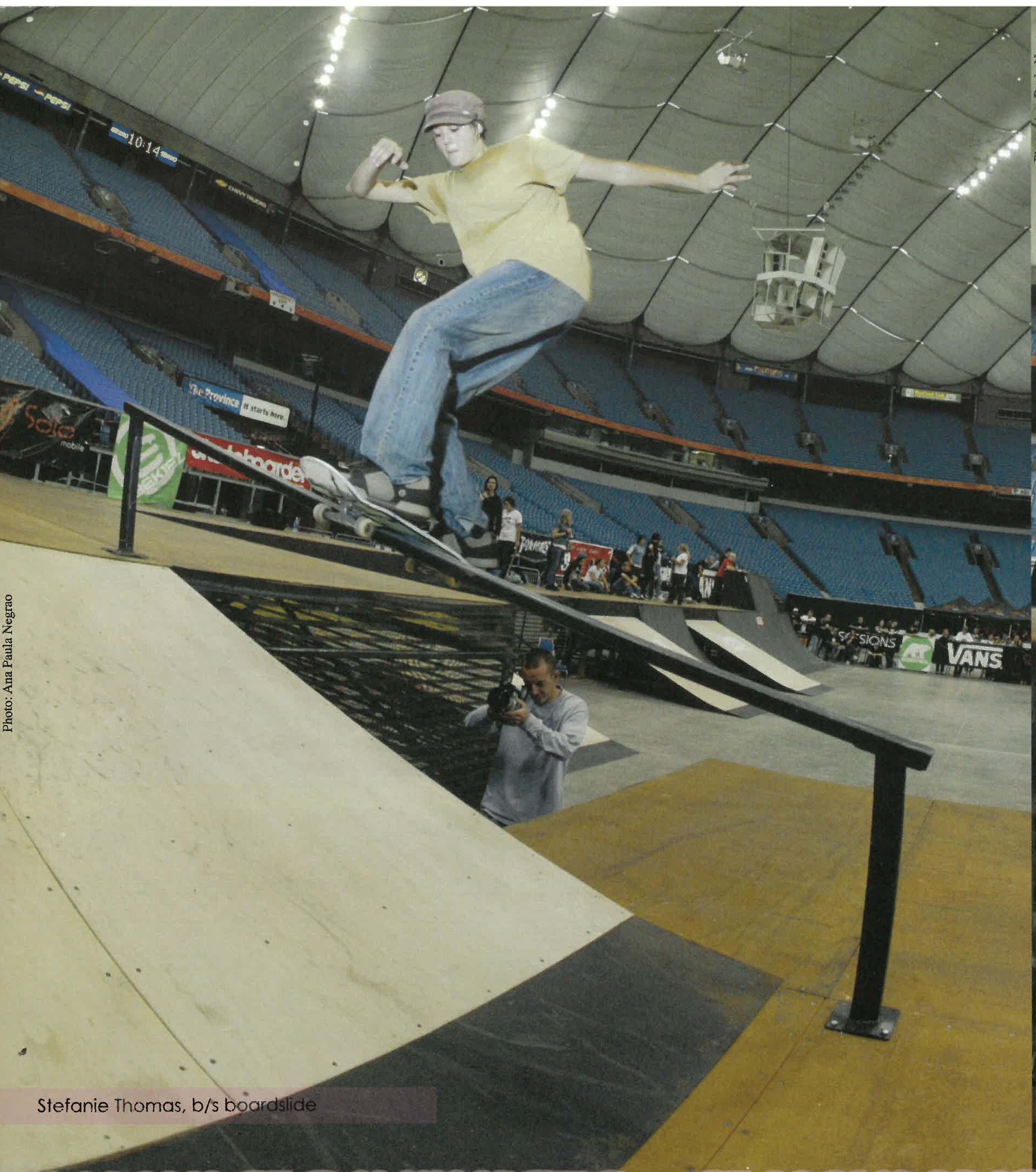 In 2001, Stefanie placed 2nd at Slam City Jam in Vancouver behind Vanessa Torres and ahead of Jaime Reyes. In a report on the event by Rhianon Bader for her website Skate of Mind, she said that Thomas’s run stood out in her mind and “included a kickflip up the step up, a 50-50 along the stair grind box thing, boardslides on the flat bars and a big kickflip over the gap to drop near the Shorty’s rail.” She followed up that result with another 2nd place in Cleveland that year.