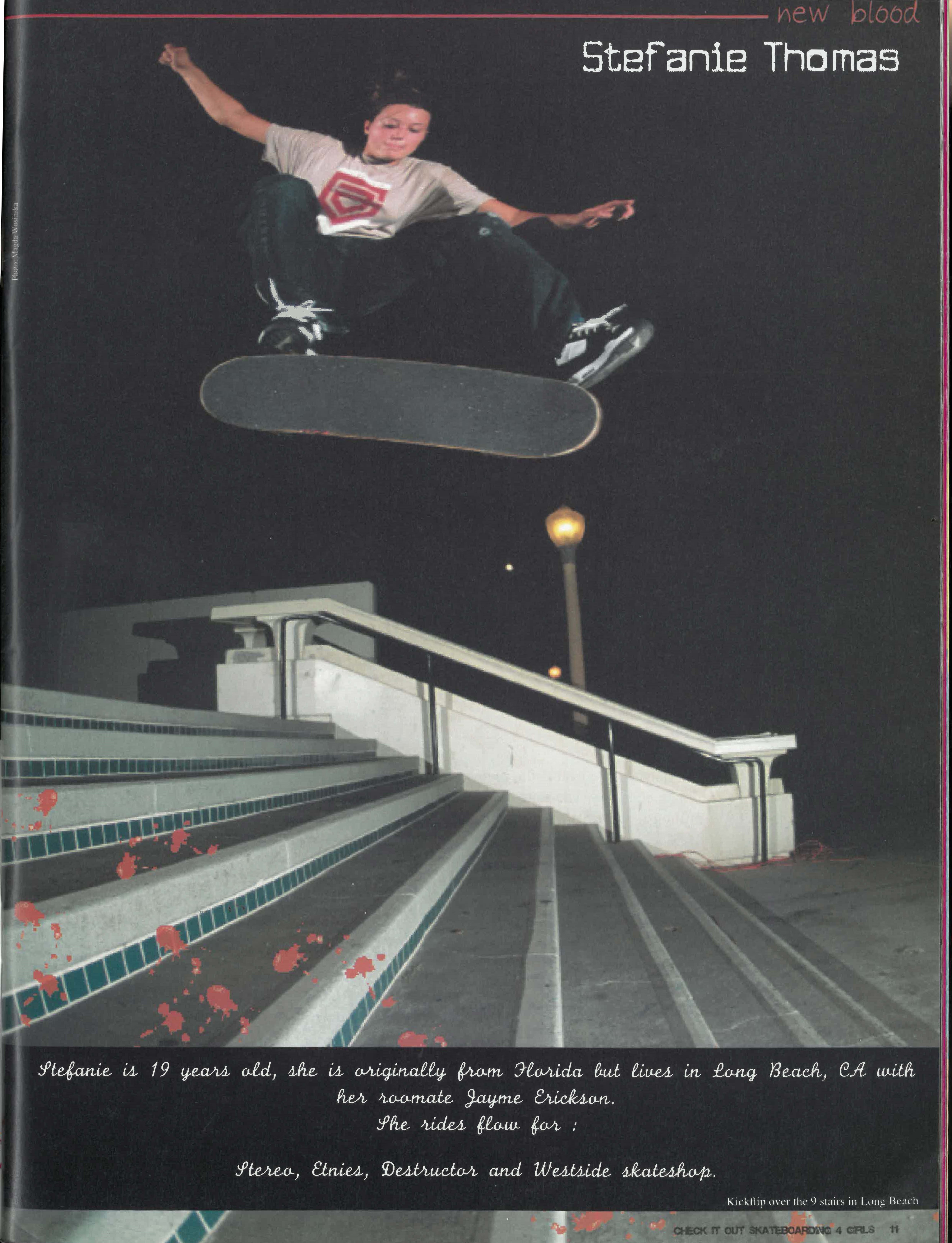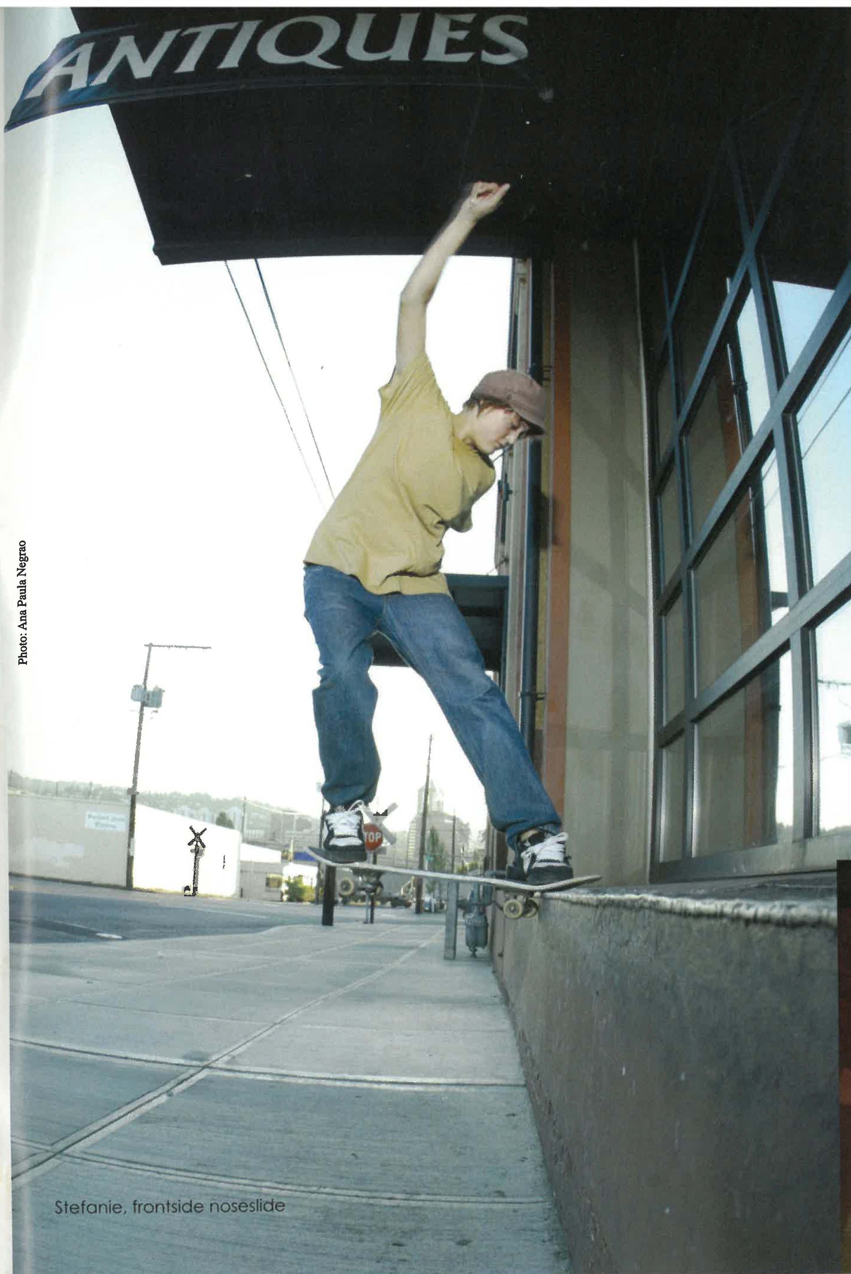 Stefanie had several photos published in the female-focused magazine, Check it Out including issue #17 from 2004 with a kickflip over a 9-stair and manual in Portland by Magda Wosinska. Ana Negrao documented her b/s boardslide while competing at Slam City Jam for issue #18 in 2005 as well as a f/s noseslide in the city streets.