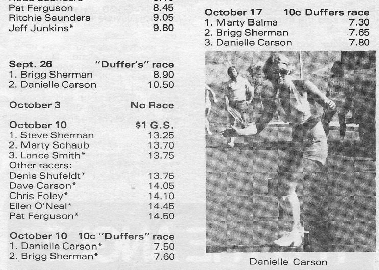 - Danielle Carson, possibly related to a Dave Carson, is looking flashy skating slalom at La Costa, published within the November 1976 issue.