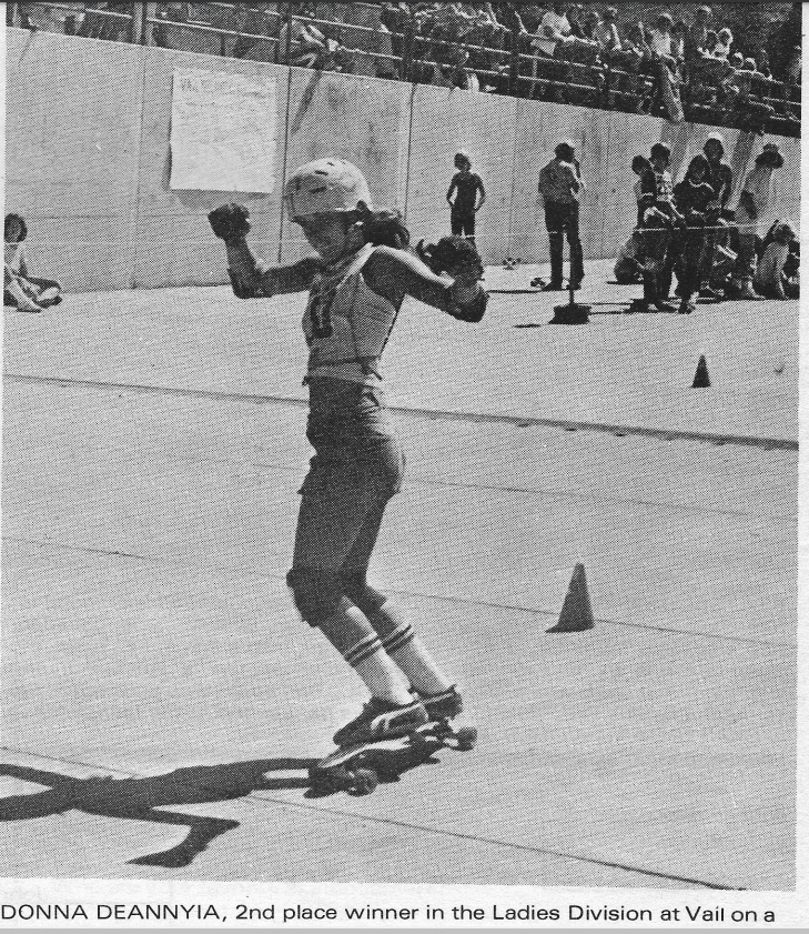 - Donna Deanniyia (Deannyea ?) is getting speed at a slalom race, showcased within the August 1977 issue. She appeared in a few LaCosta race results, as well taking first place in both the Slalom and Banked Slalom events for women age 17-22 at the State Championships at Runway park in Carson, riding for Sparks Carlsbad, as reported on in November 1977.