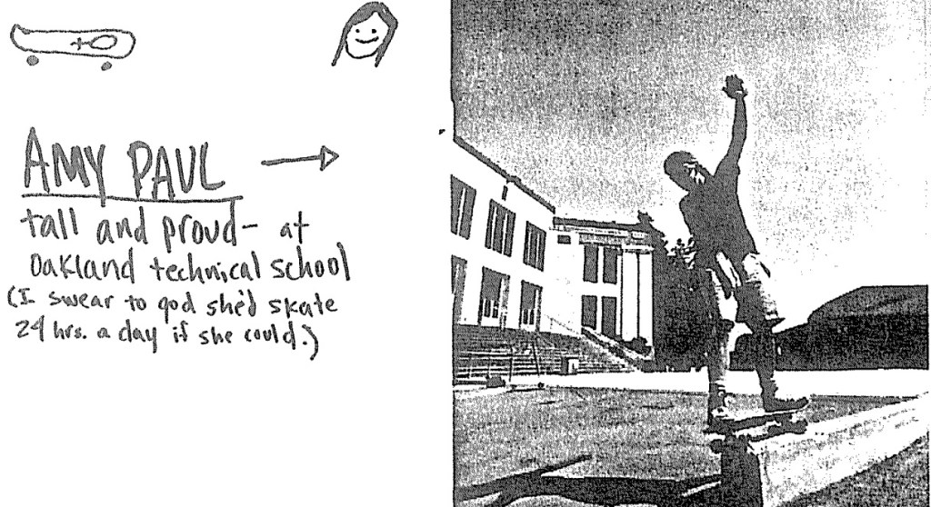 Back in the 1980s, when a female skater heard rumour of another girl who skated, they were destined to meet! This was the situation for KZ Zapata, author of the zine Push, Push, then Go! when she first met Amy Paul in San Francisco, at a famous spot called “The Dish” in Hunter’s Point which was a kind of mecca in the 1980s, as seen in the classic contest video from 1985: