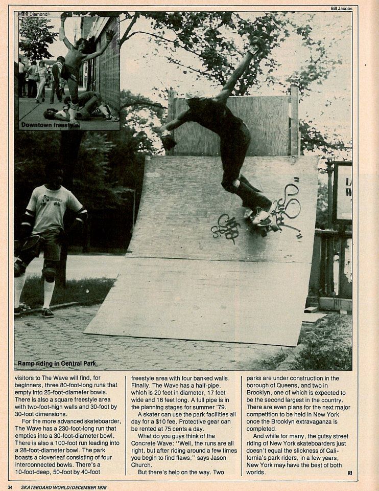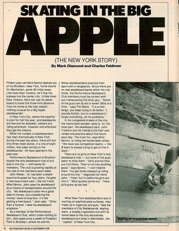 In Skateboard World magazine for December 1978, there’s an article about the scene in New York called, “Skating in the Big Apple” by Mark Diamond and Charles Feldman. In Brooklyn, there was a team called “Performance Skateboard” which met up at Prospect Park, even though it wasn’t an actual skateboard park, and more of just a collection of DIY wooden ramps.