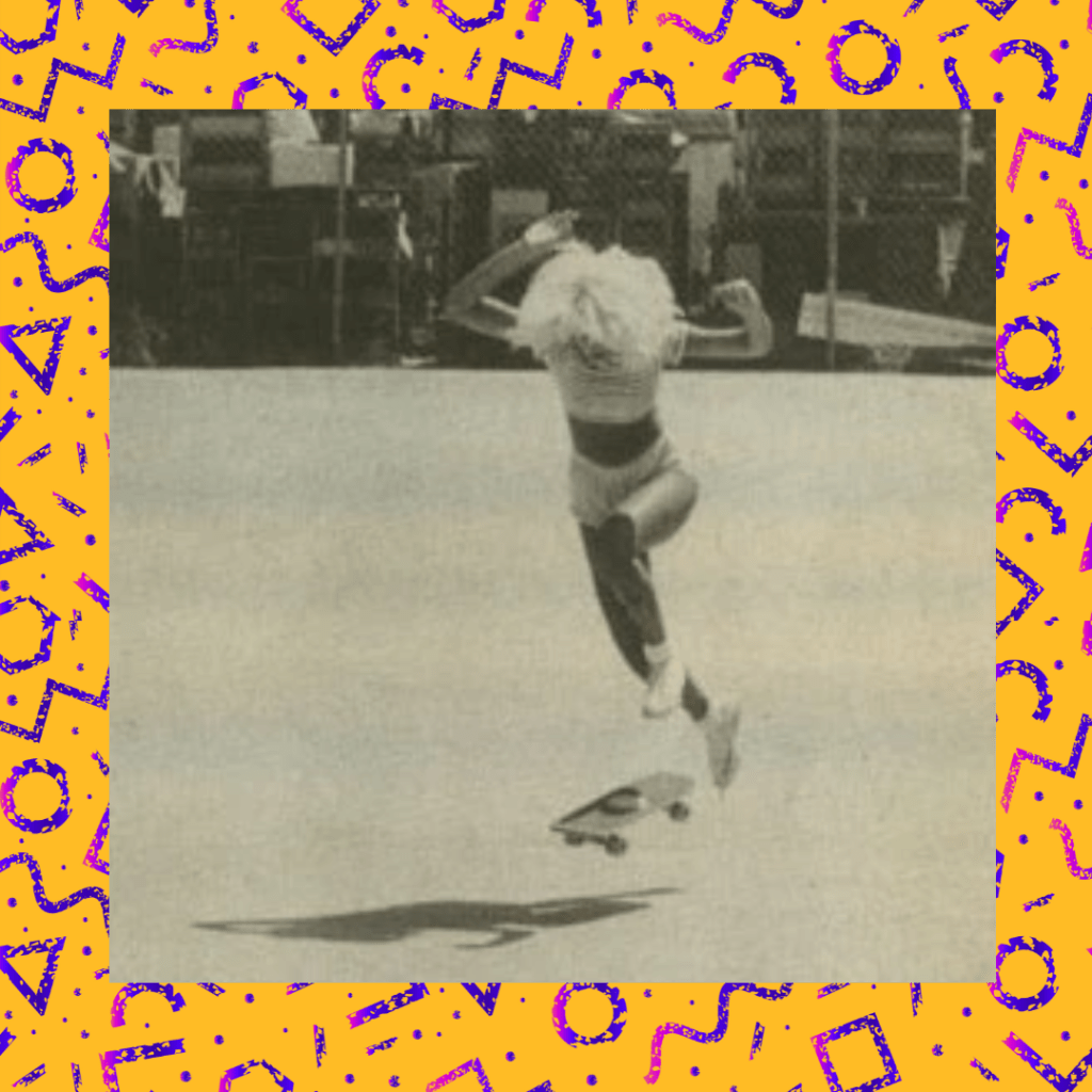 Leslie Anne Miller was a competitive skateboarder in the early 1980s, and like her peer, Diane Veerman (Desiderio) she had a classic 80s look! Freestyle was her preference, and Leslie was consistently placing strongly, even against the guys. Note: sometimes her name is misspelled “Leslee Ann Miller.”