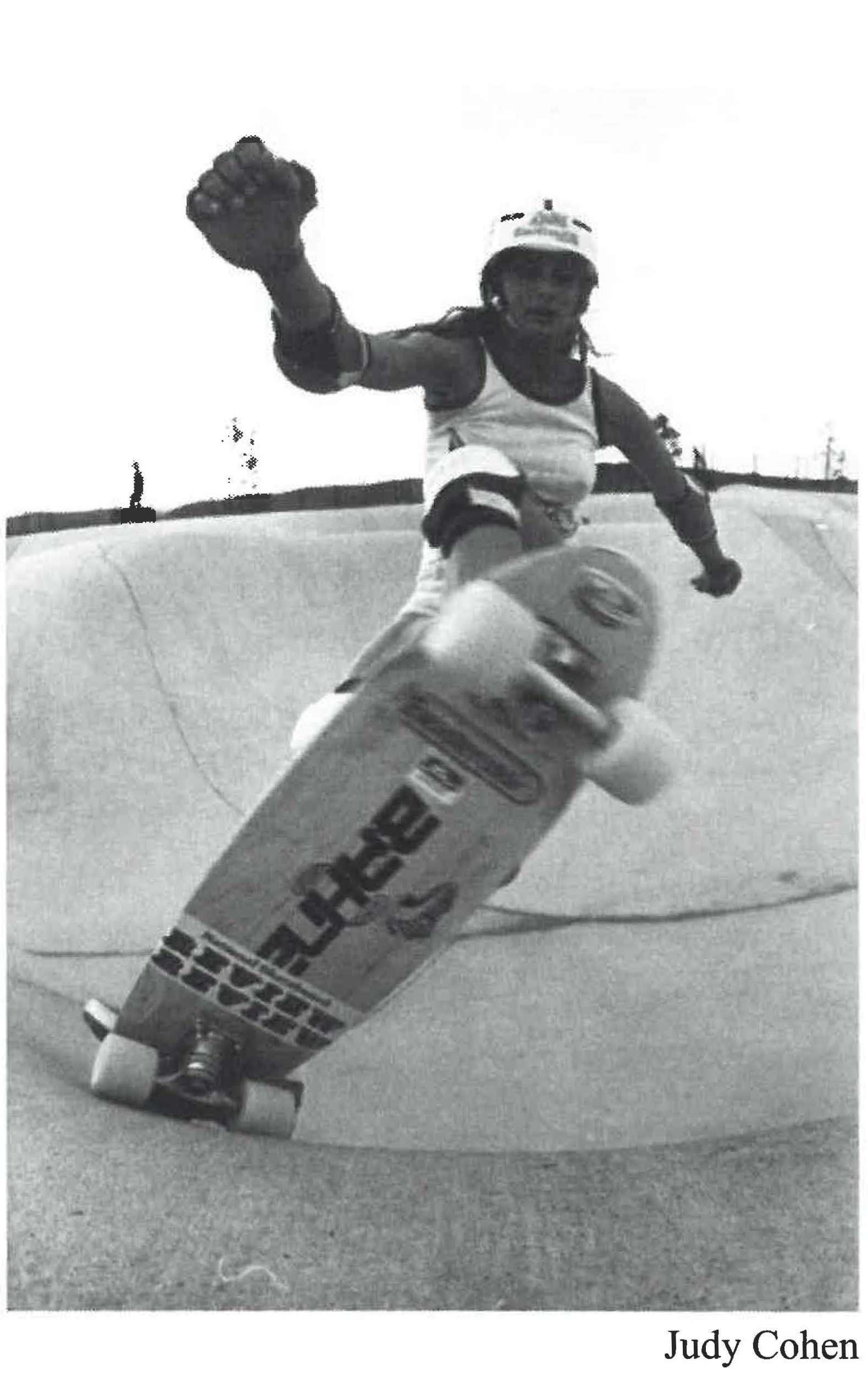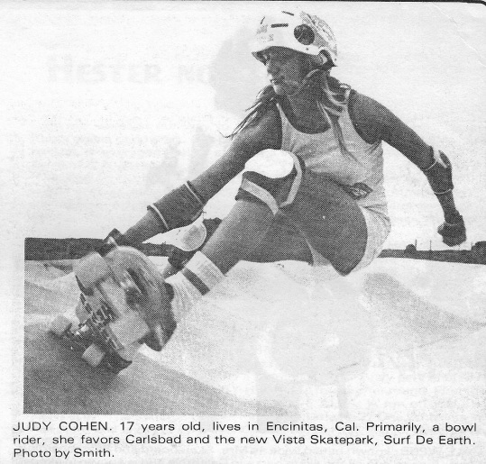 On Page 14, Judith appears within the women’s feature with another photo by Smith. The caption explains that she is 17 years old, lives in Encinitas, CA and is primarily a bowl rider favoring “Carlsbad and the new Vista Skatepark, Surf De Earth.” Even forty years later Judith confirmed that, “The Carlsbad skatepark was the best… that was one of the first skateparks that had a mogul field. I’d be hesitant to do it right now with this 63-year-old body, but it was so good, we had such good times!”
