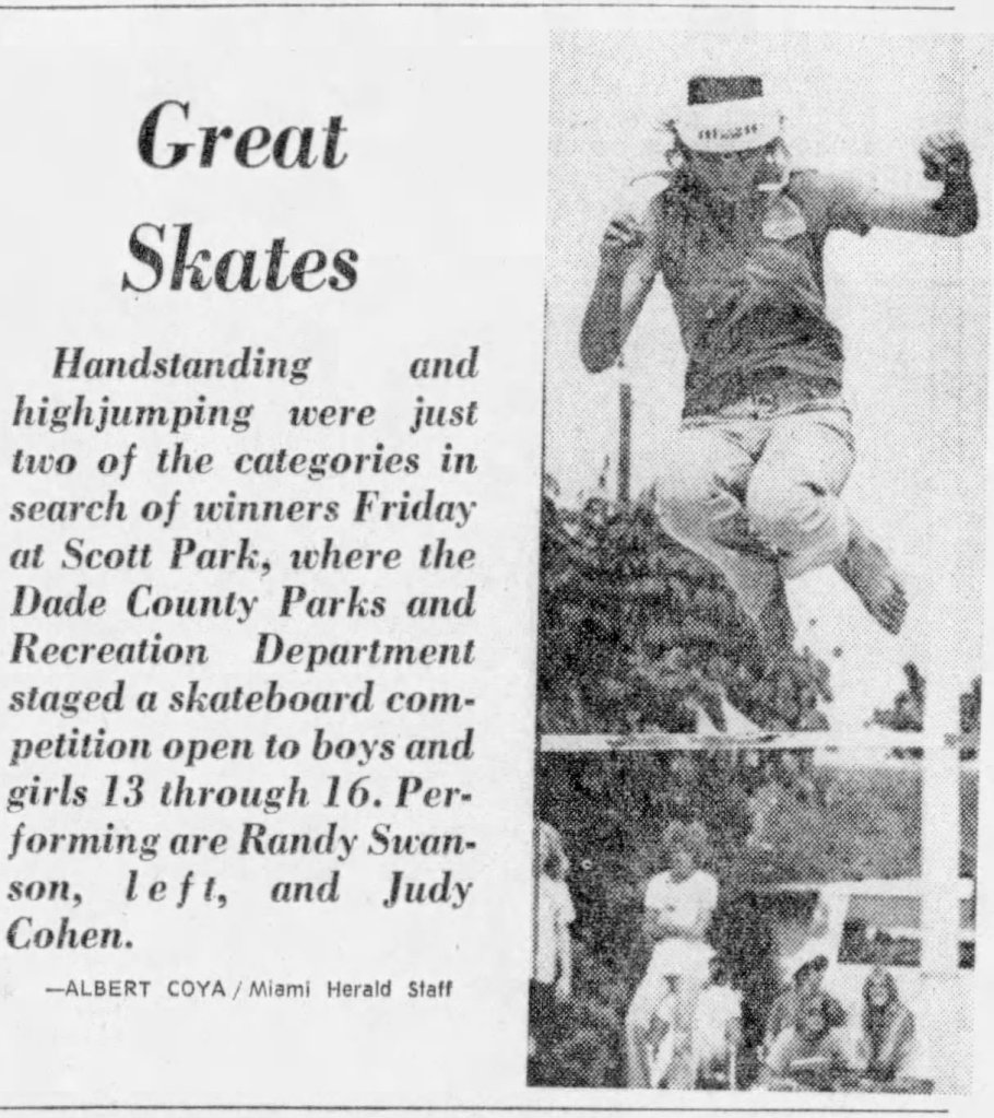 Judith preferred the adrenaline rush of riding transition over freestyle skating and events like the one hosted by the Dade County Parks and Recreation Department. Judith had little recollection of Albert Coya taking her photo for the April 17, 1976, issue of the Miami Herald high-jumping at a contest at Scott Park in Florida.